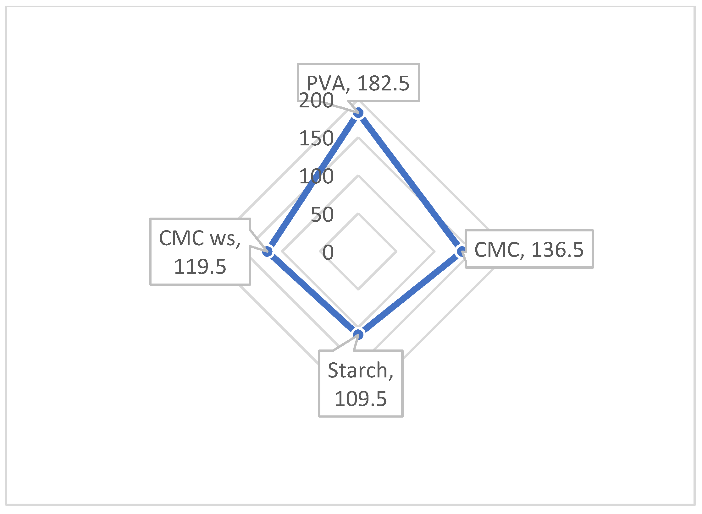 Four different sizing agents, maize starch, carboxymethyl cellulose (CMC), polyvinyl alcohol (PVA), and wheat straw-derived carboxymethyl cellulose (CMCws), were applied at varying concentrations, and their effects on the mechanical properties of the cotton yarn were summarized in Table 4.