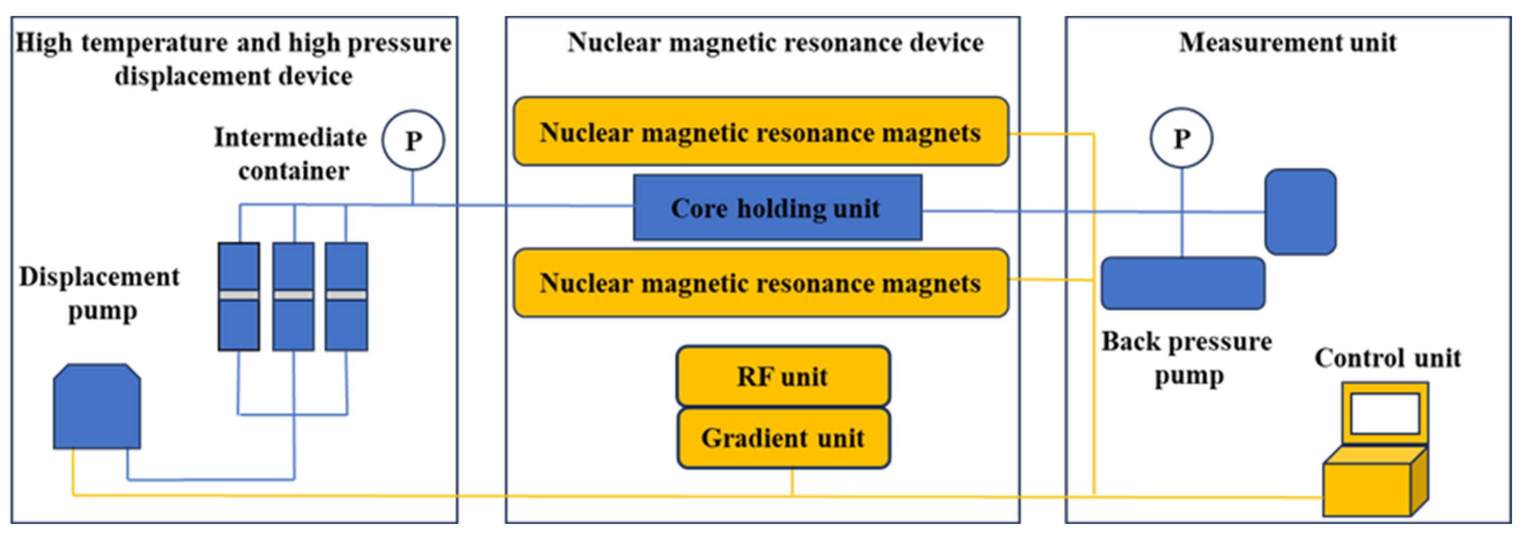 Figure 1. During operation, the displacing fluid and other liquids are loaded into a central reservoir, while the core sample is positioned within a specialized holder. Fluid injection is conducted through a pump system. The NMR analyzer enables real-time monitoring without halting the experiment or removing the core repeatedly.