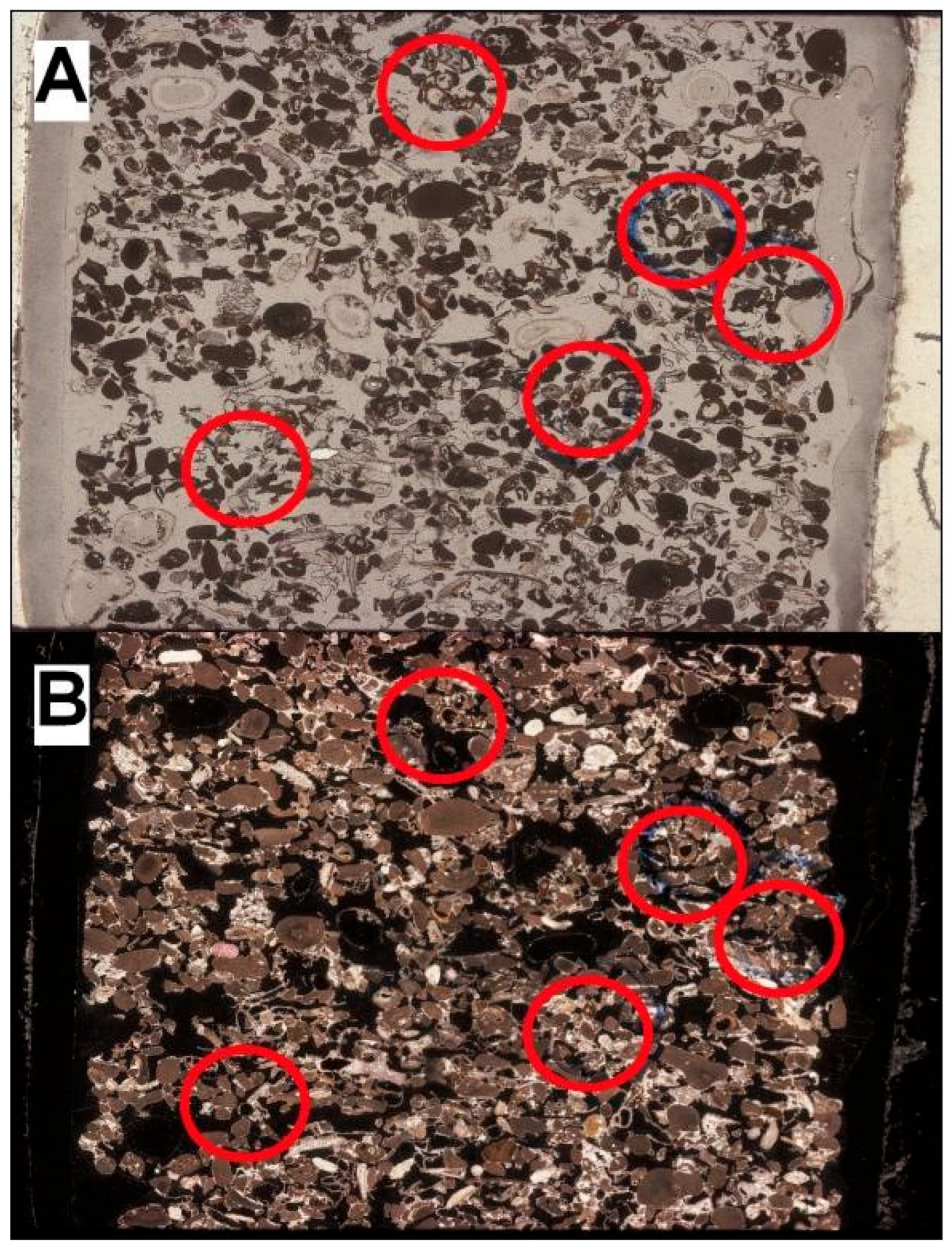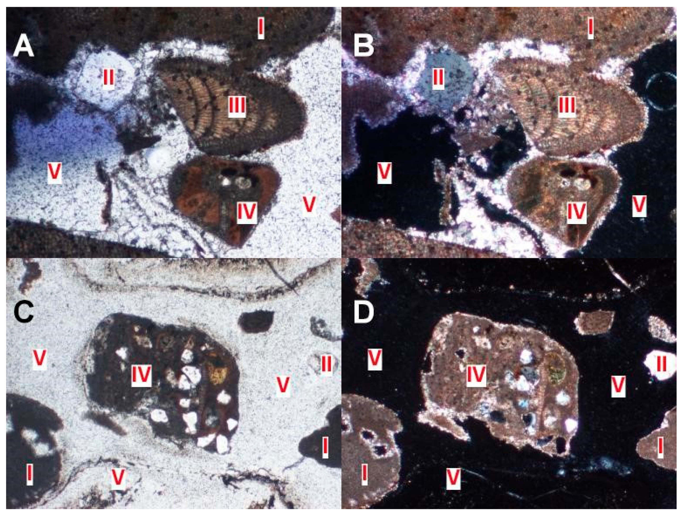 - Folk, R.L. Practical petrographic classification of limestones. Bull. Am. Assoc. Petrol. Geol. 1959, 43, 1–38. [Google Scholar] [CrossRef]