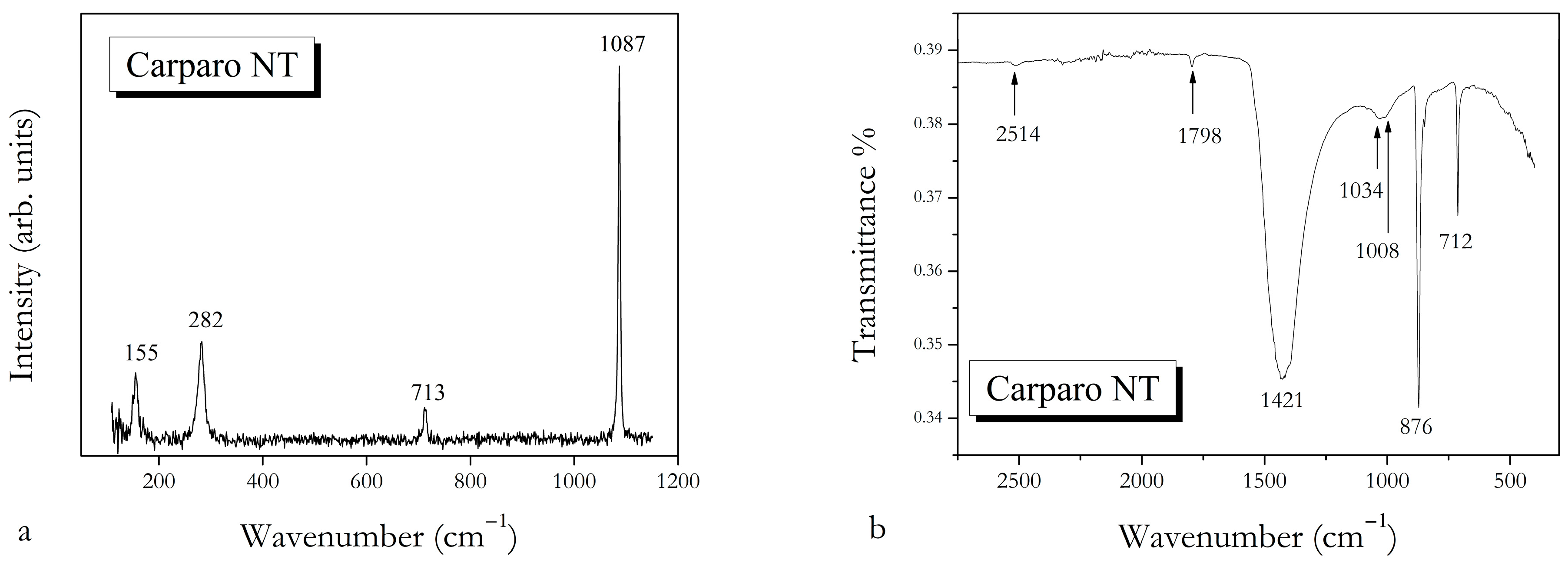 - Gunasekaran, S.; Anbalagan, G.; Pandi, S. Raman and infrared spectra of carbonates of calcite structure. J. Raman Spectrosc. 2006, 37, 892–899. [Google Scholar] [CrossRef]