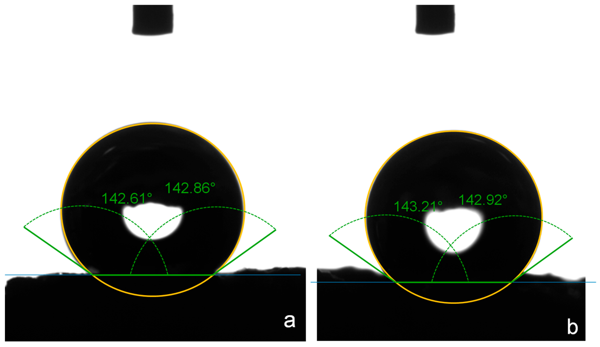 | Samples | ΔE* Before and After Aging (Averaged from 6 Points per Sample) | Contact Angle (°) (Averaged from 6 Drops per Sample) |