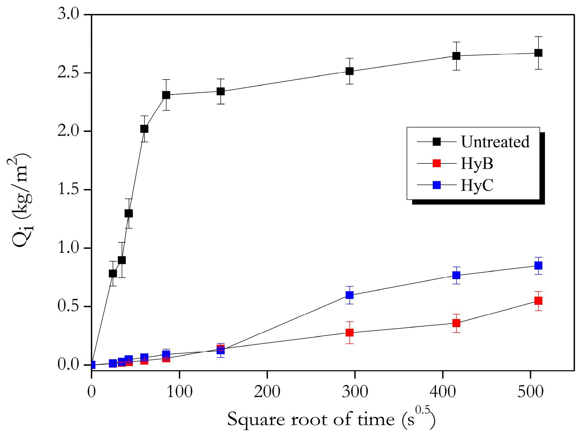 | * Capillary water absorption | 5 untreated 5 HyB 5 HyC | 5 × 5 × 1 | 1 | UNI EN 15801:2010 [51] |