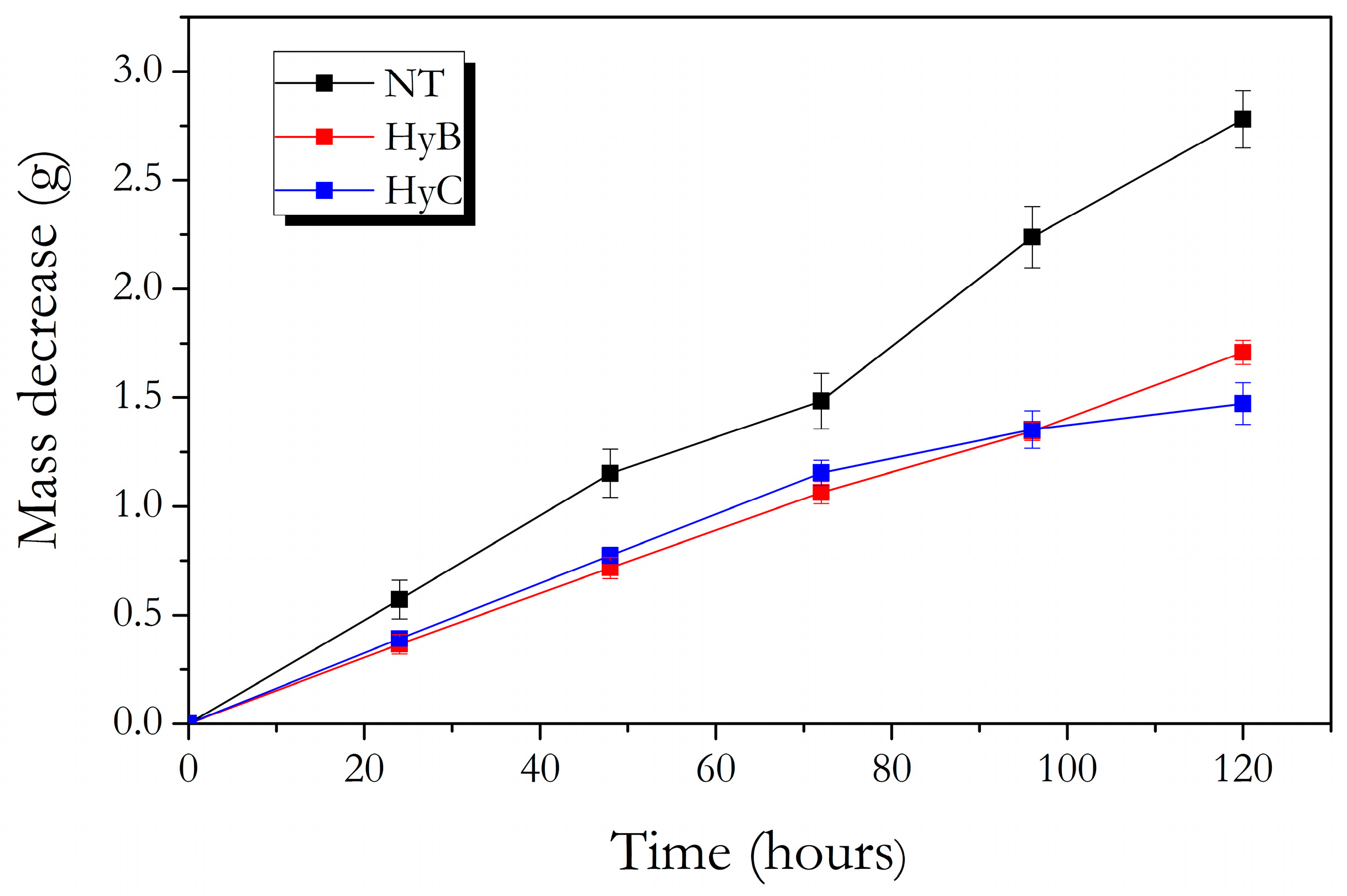 | SEM-EDS | 1 untreated 1 HyB 1 HyC | 1.5 × 1.5 × 0.5 | 1 | |