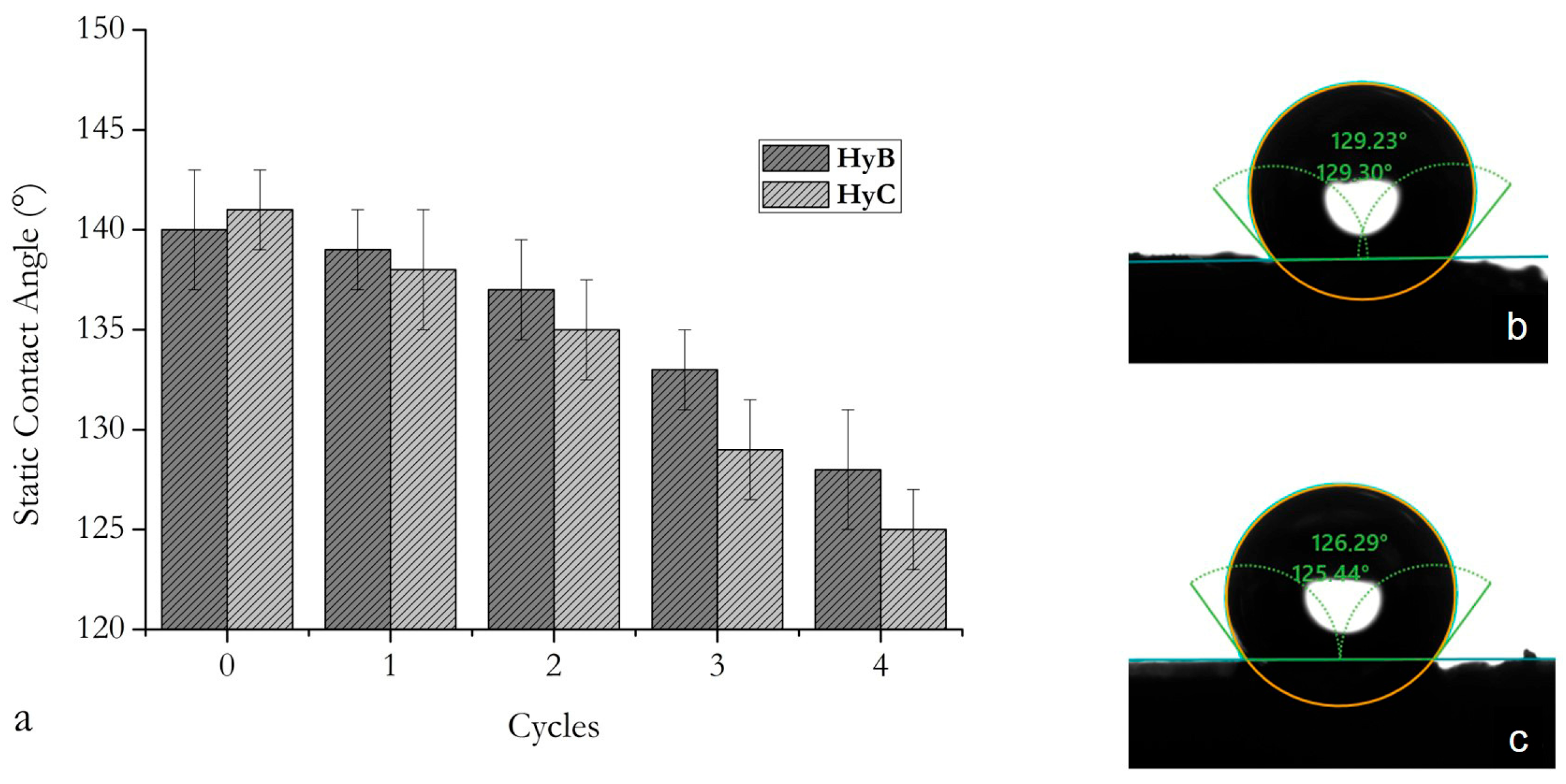 | * Static contact angle | ** 5 HyB ** 5 HyC | 5 × 5 × 1 | 6 | UNI EN 15802:2010 [50] |