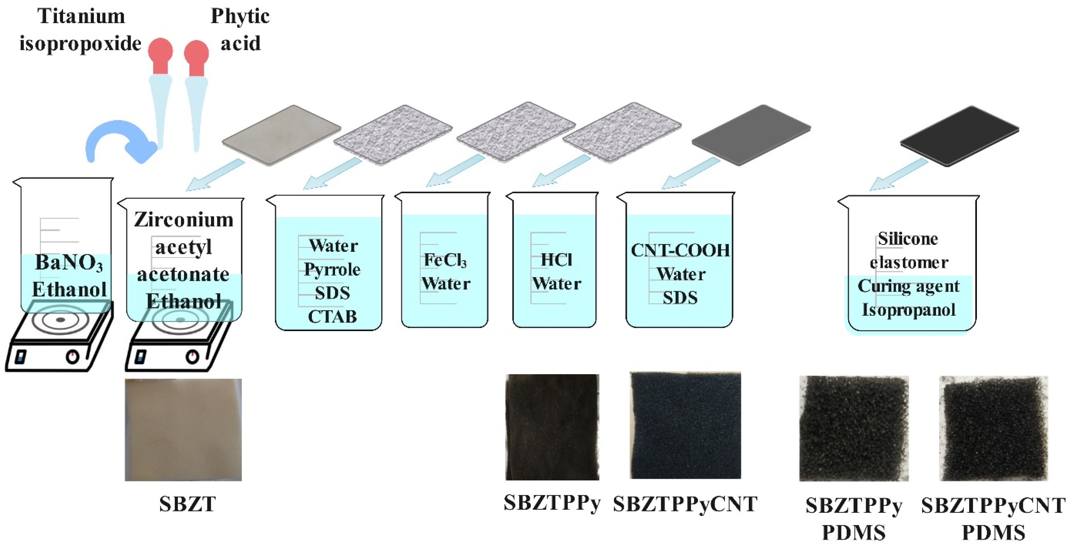 - EDS analysis validated the presence of Ba, Zr, and Ti in the sponge samples coated via the sol–gel process, while the subsequent PPy coating introduced nitrogen, iron and chlorine presence, and PDMS application resulted in Si content on the sensor samples.