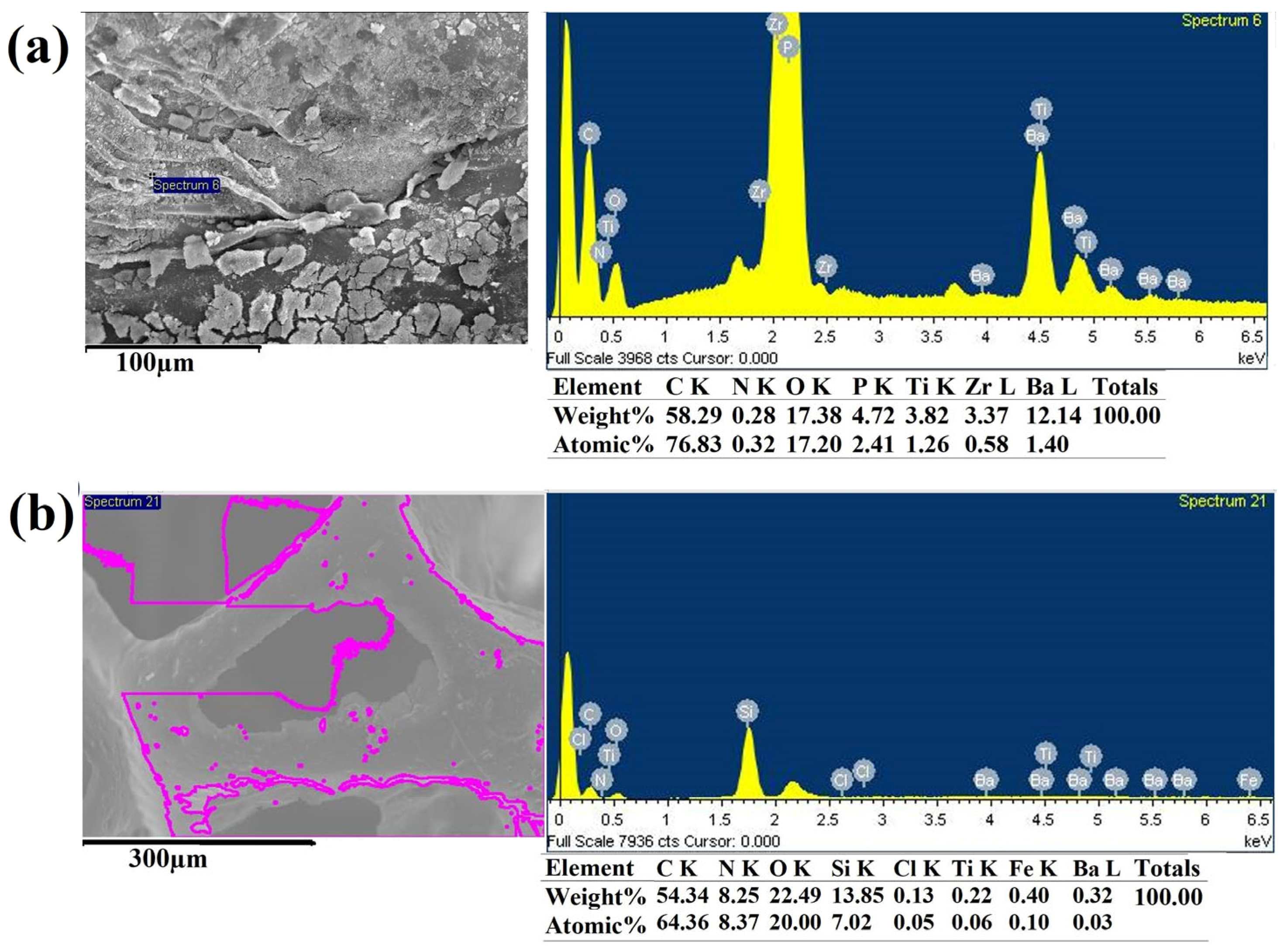 | Weight %/Standard Deviation | C | O | P | N | Ti | Zr | Ba | Si | Fe | Cl |