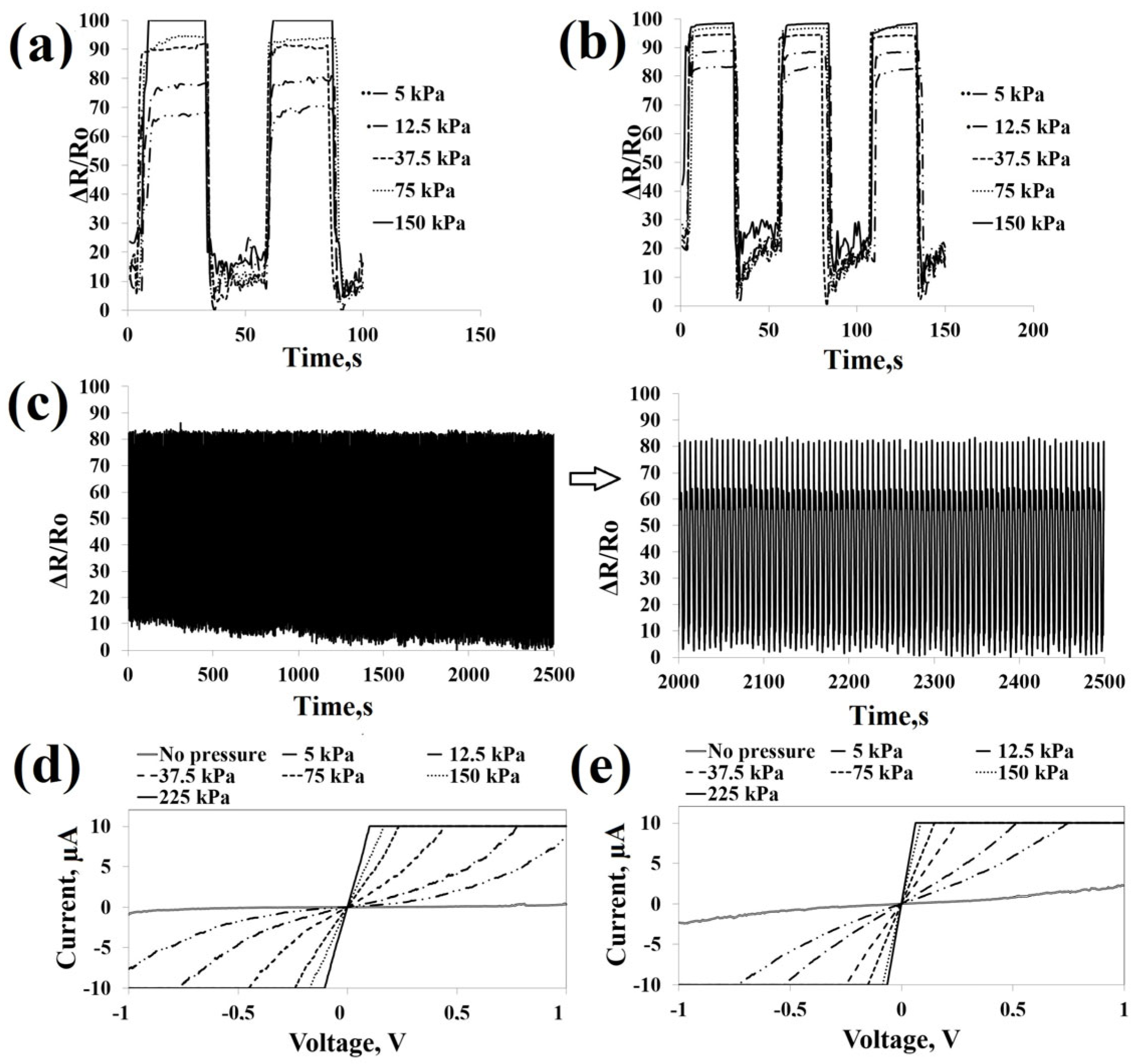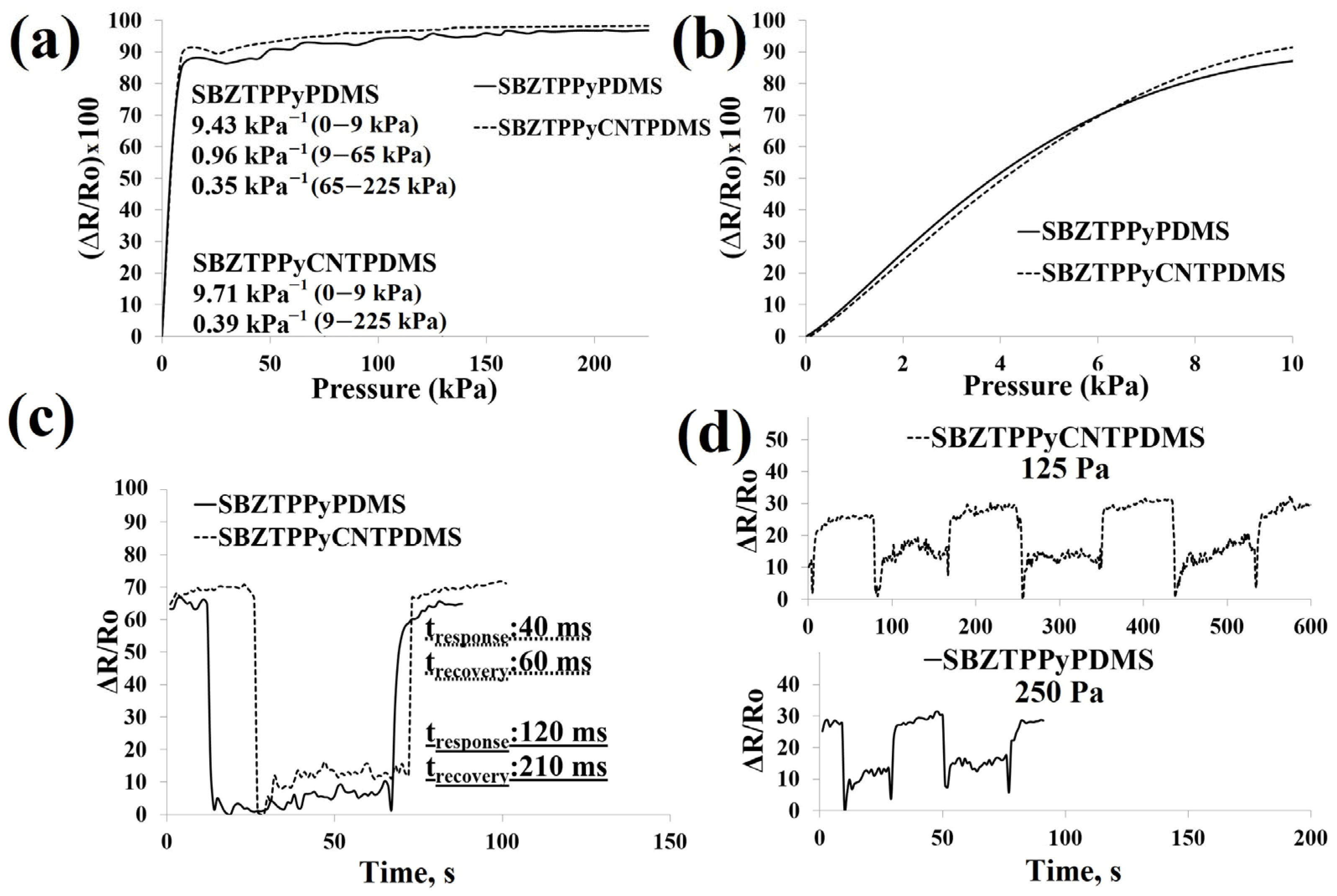 | SBZTPPyPDMS | 9.43 (0–9 kPa) 0.96 (9–65 kPa) 0.35 (65–225 kPa) | 250 Pa | 120 | 210 | >750 | 1.05 V–0.16 |