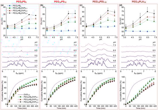 | Copolymer | OVP Loading (mg/mg) | CMC (mg/L) a | OVP EE% b | OVP Loading (wt%) c | Dh (nm) at pH 7.3 d | PDI at pH 7.3 d | Dh,theo (nm) e | ζ (mV) f |