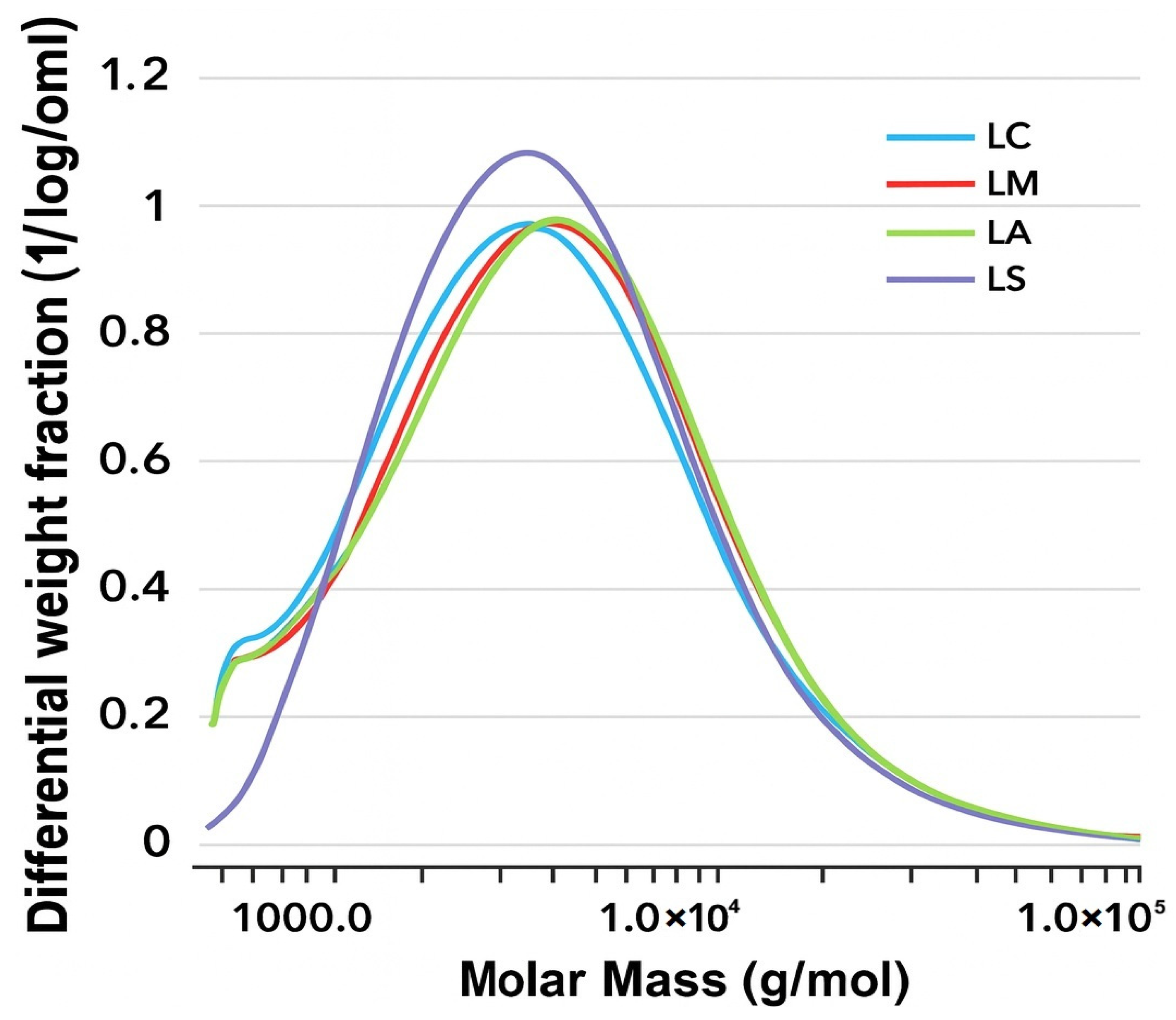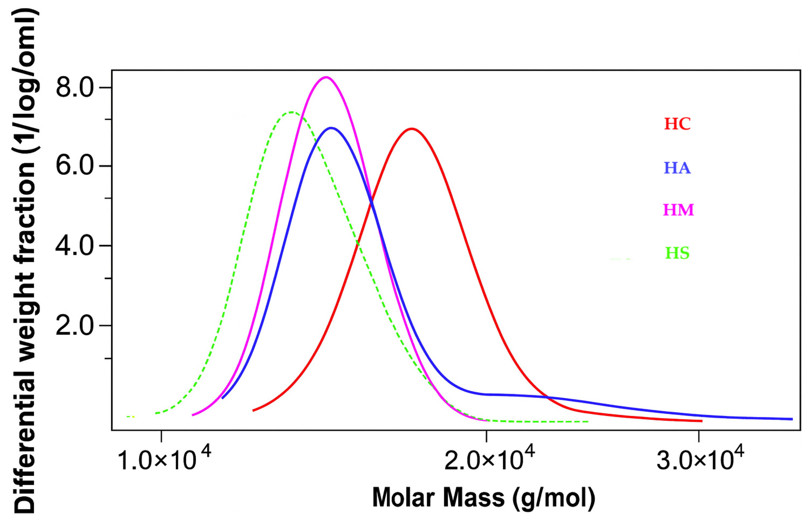 In contrast, the HS displayed a unimodal distribution with a single peak at approximately 13,700 g/mol.