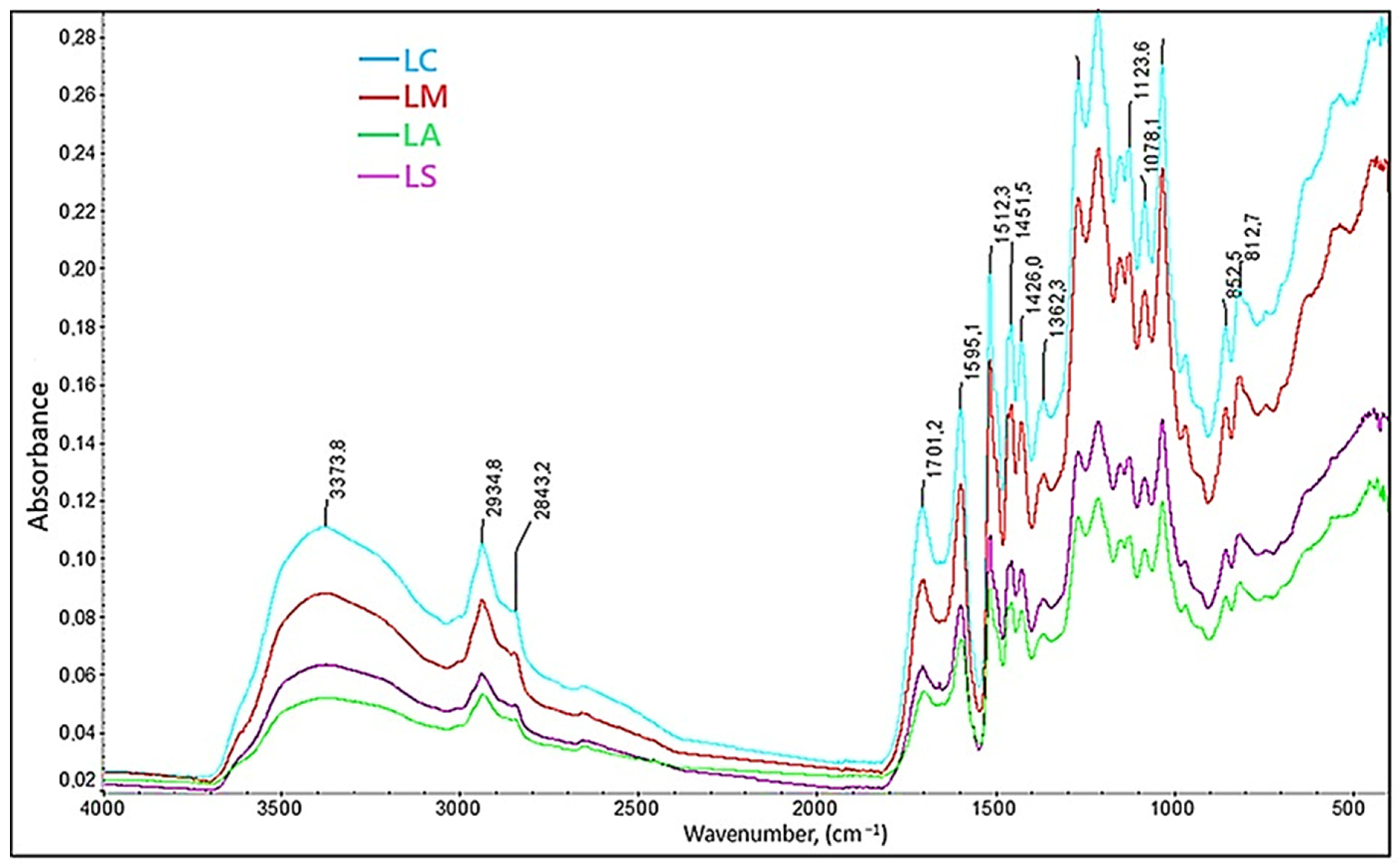 −1) vibrations. In contrast, LA exhibited the lowest overall absorbance intensities. These differences in peak intensities suggest subtle variations in the lignin structures, particularly an increase in carboxyl group content, which can be attributed to the specific extraction conditions associated with each acid [