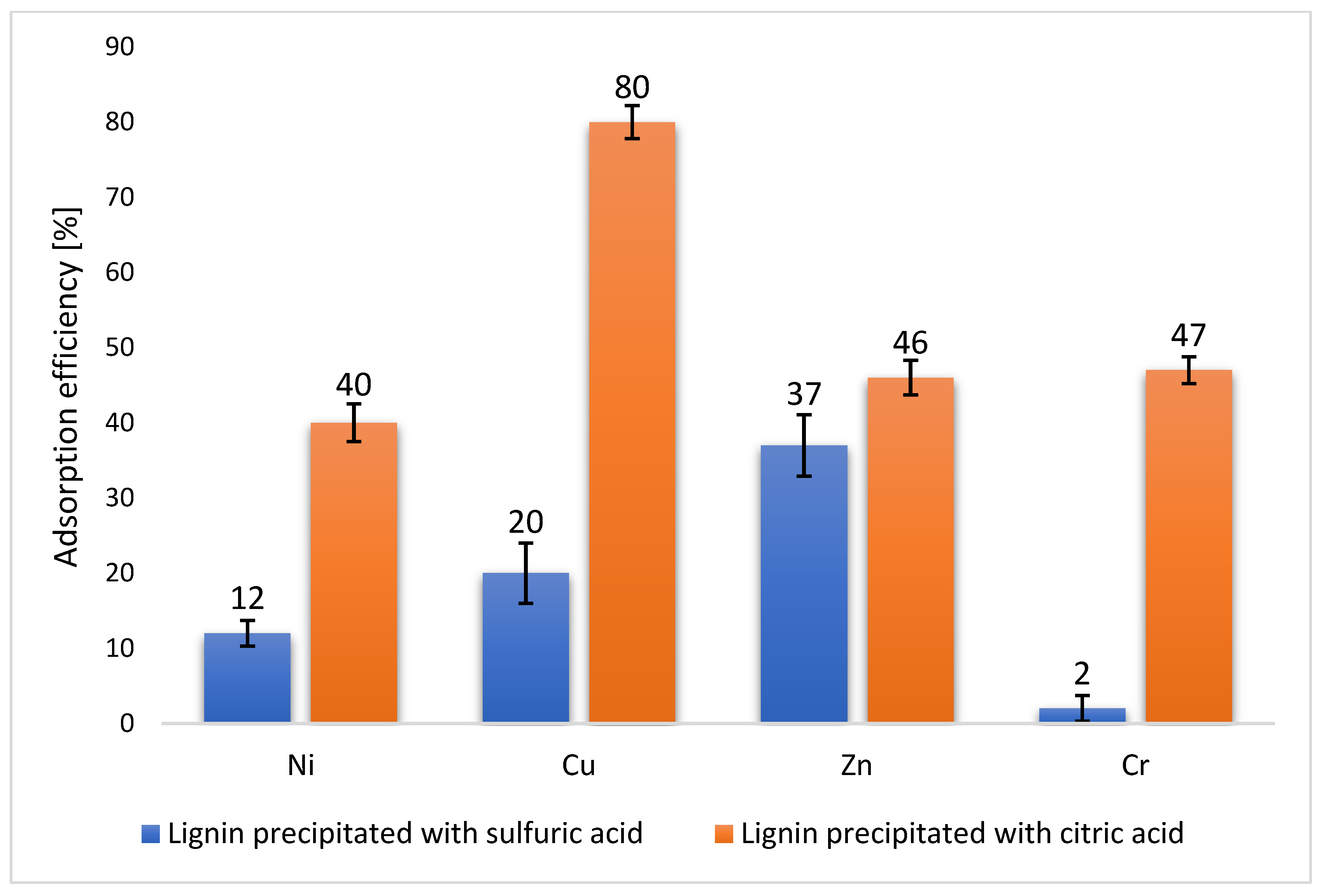 The significantly higher adsorption efficiency of LC, particularly for copper (80%) and chromium (46%), can be attributed to several factors. The citric acid extraction process likely alters the lignin’s molecular structure, potentially increasing the number of available binding sites or enhancing its interaction with metal ions. This structural modification is evidenced by the increased carboxyl group content observed in the elemental analysis of citric acid-extracted lignin.