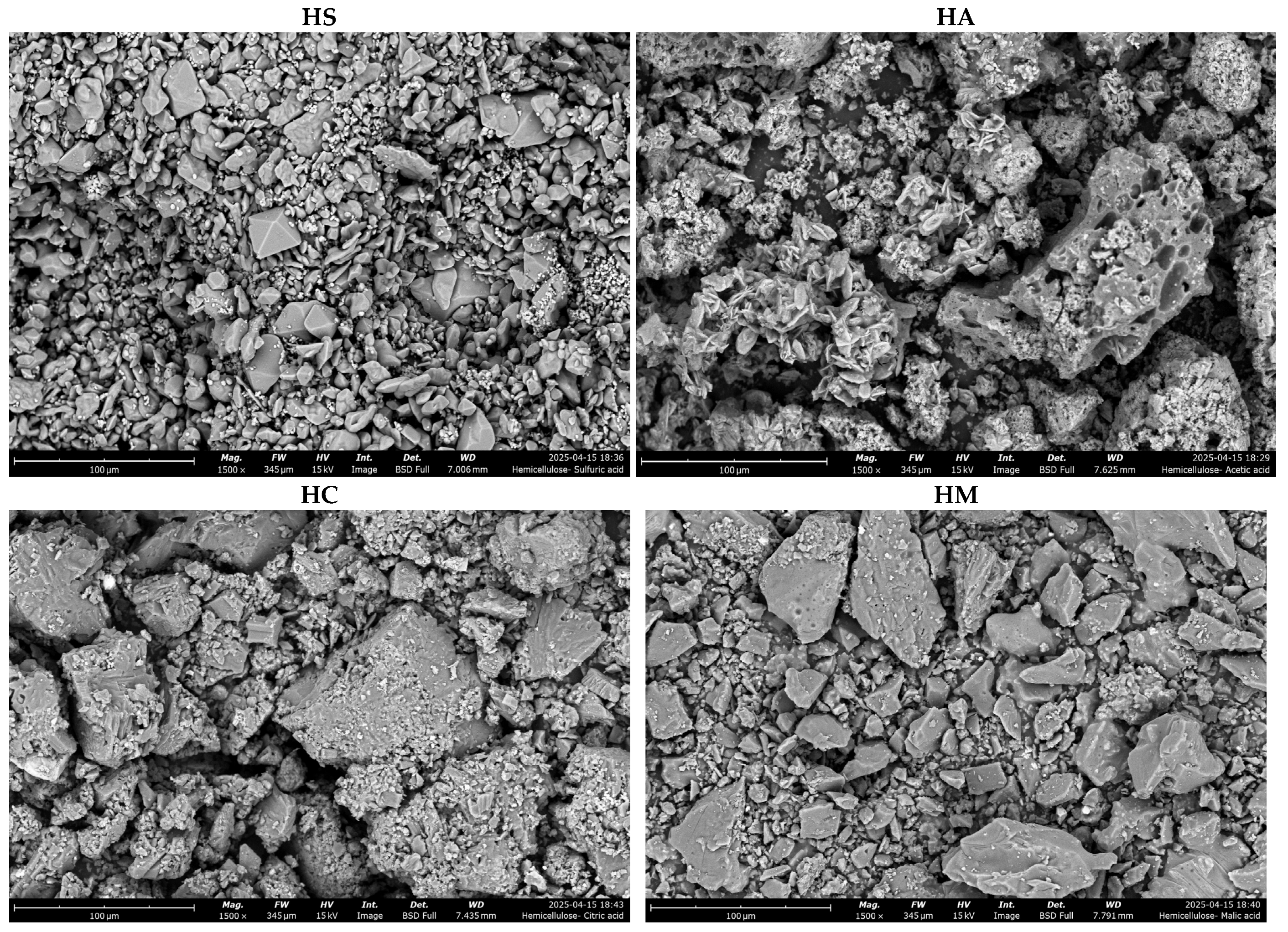 The surface morphology and elemental composition of the hemicelluloses were analyzed using Scanning Electron Microscopy (SEM) and Energy-Dispersive X-ray Spectroscopy (EDS). Hemicelluloses recovered from the supernatants of organic acid-based precipitations consistently exhibited a more porous and irregular surface structure. Conversely, the HS showed a dense, compact, and more uniform morphology (