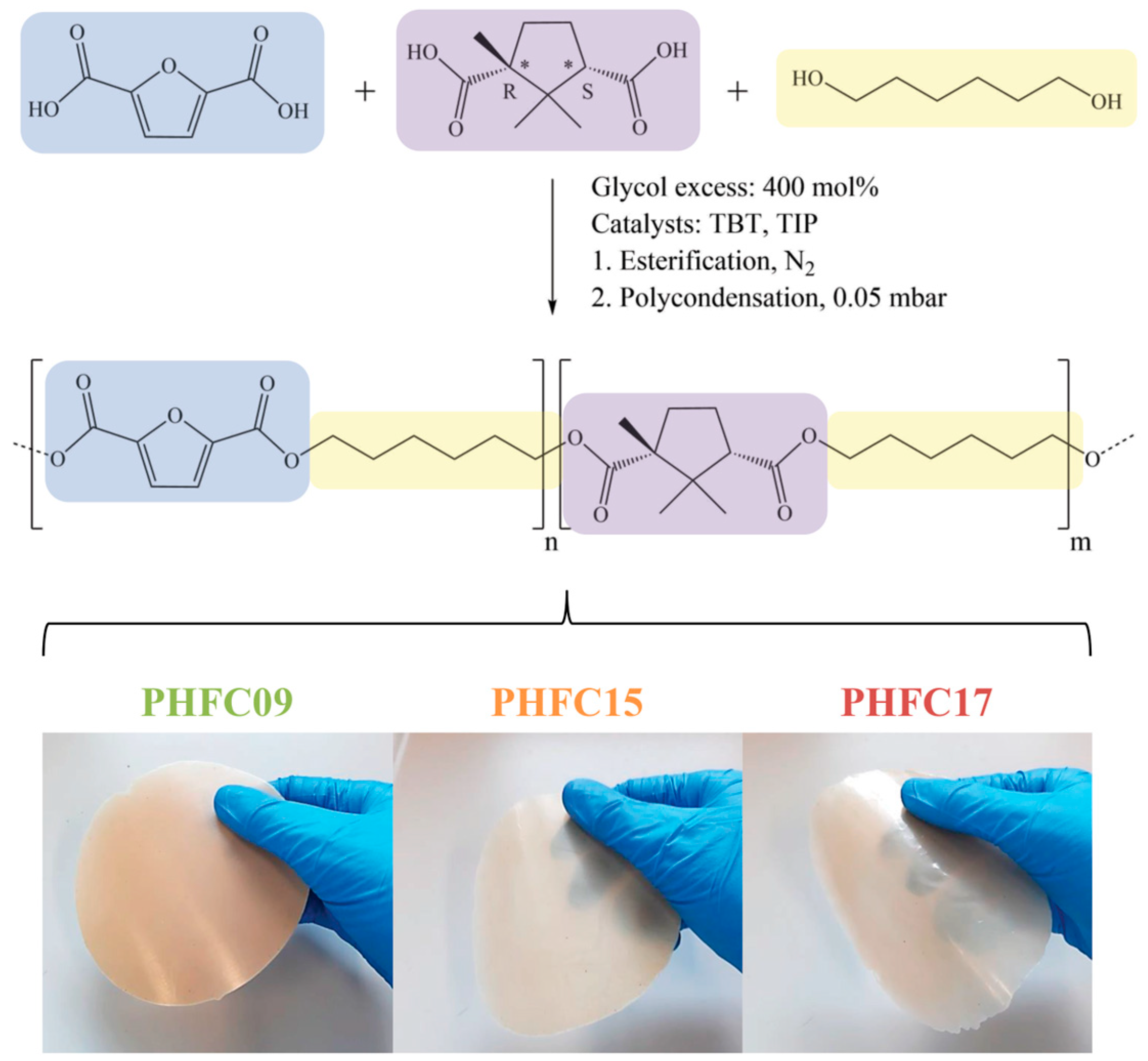 - Guidotti, G.; Burzotta, G.; Soccio, M.; Gazzano, M.; Siracusa, V.; Munari, A.; Lotti, N. Chemical Modification of Poly(Butylene Trans-1,4-Cyclohexanedicarboxylate) by Camphor: A New Example of Bio-Based Polyesters for Sustainable Food Packaging. Polymers 2021, 13, 2707. [Google Scholar] [CrossRef]