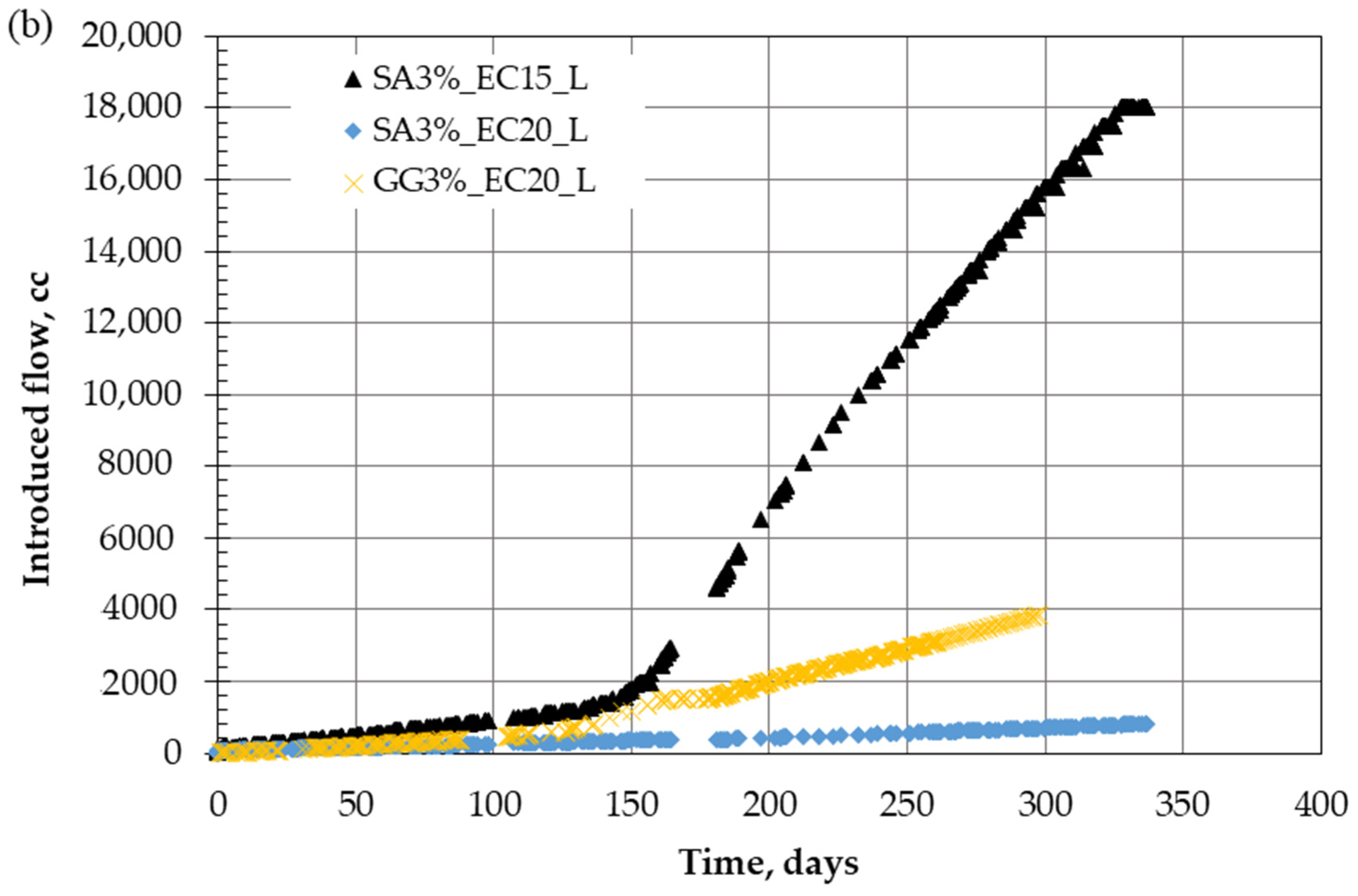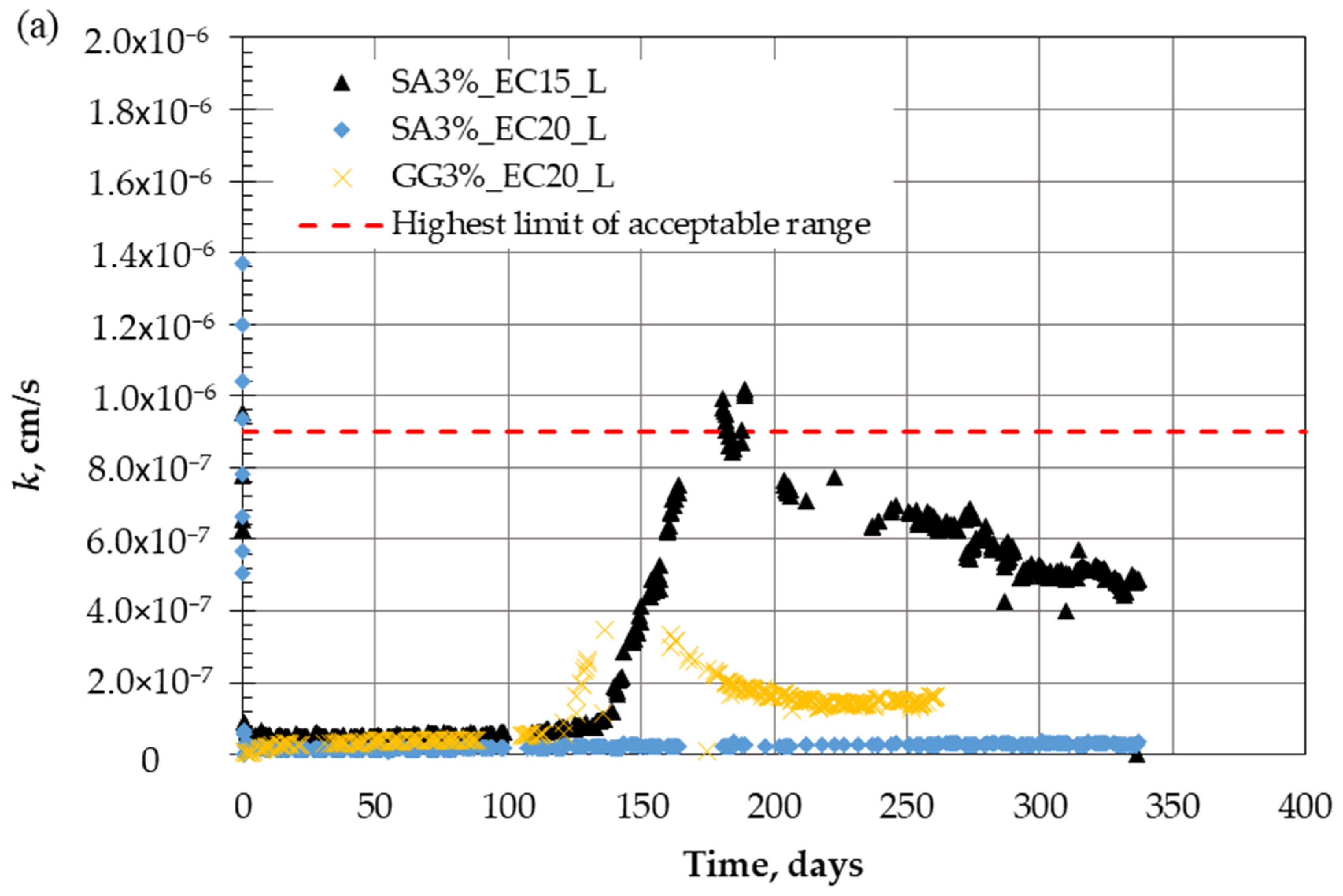 - Incorporating a 3% biopolymer (SA and GG) significantly enhanced the long-term stability of the hydraulic conductivity for both EC150 and EC20 liners. Unlike untreated ones, the biopolymer-treated liners maintained a stable trend over an extended one-year testing period.