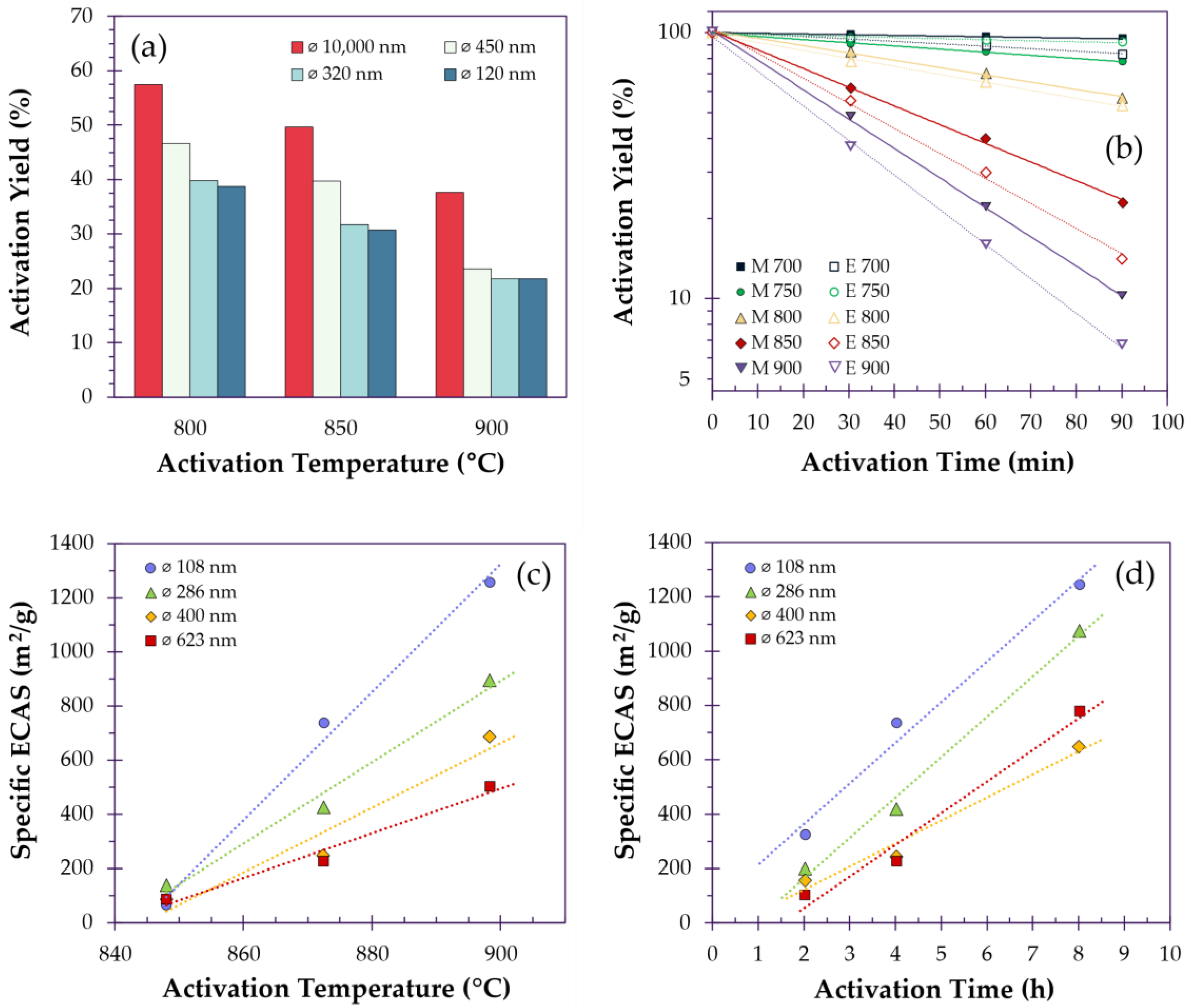 - Erben, J.; Heußner, A.; Thiele, S.; Kerzenmacher, S. Activation of electrospun carbon fibers: The effect of fiber diameter on CO2 and steam reaction kinetics. J. Polym. Res. 2021, 28, 108. [Google Scholar] [CrossRef]
