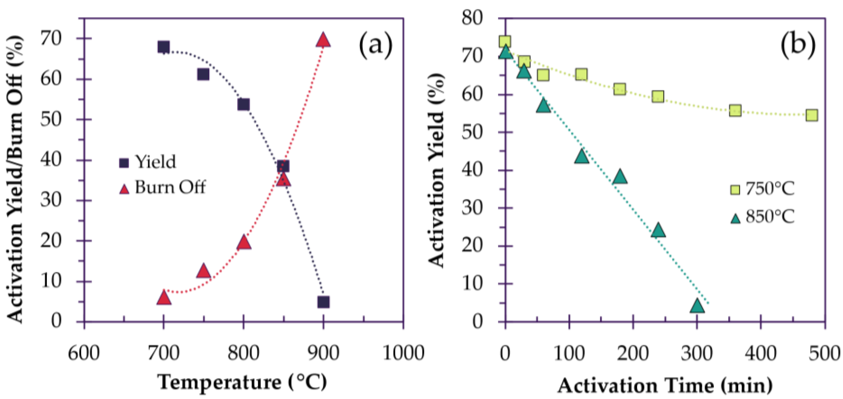| Activation Method | Precursor Material | Activation Agent † | Temperature (°C) | Time (h) | BET Surface Area (m2/g) | Microporosity (%) | Yield (%) | Ref. |