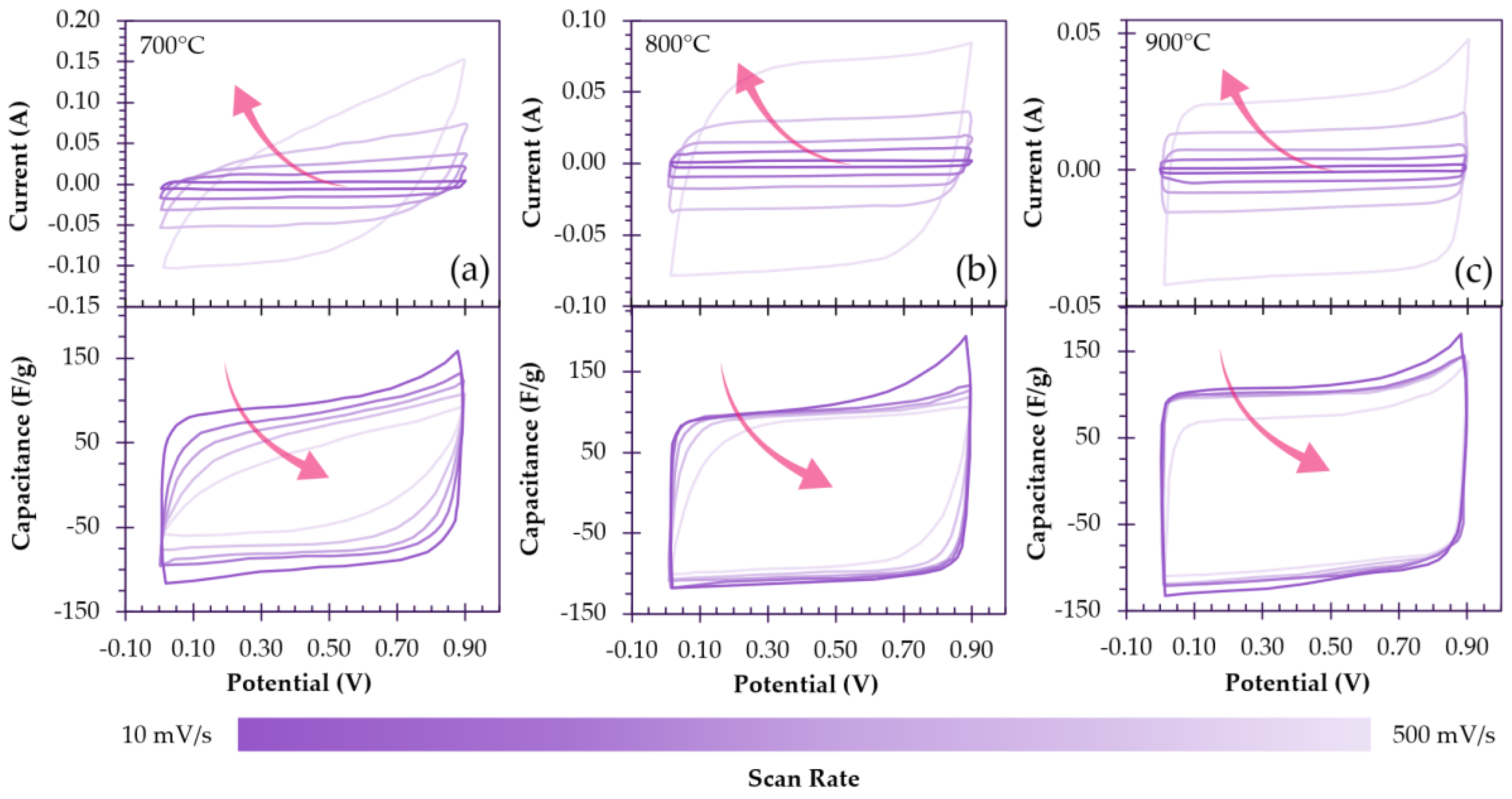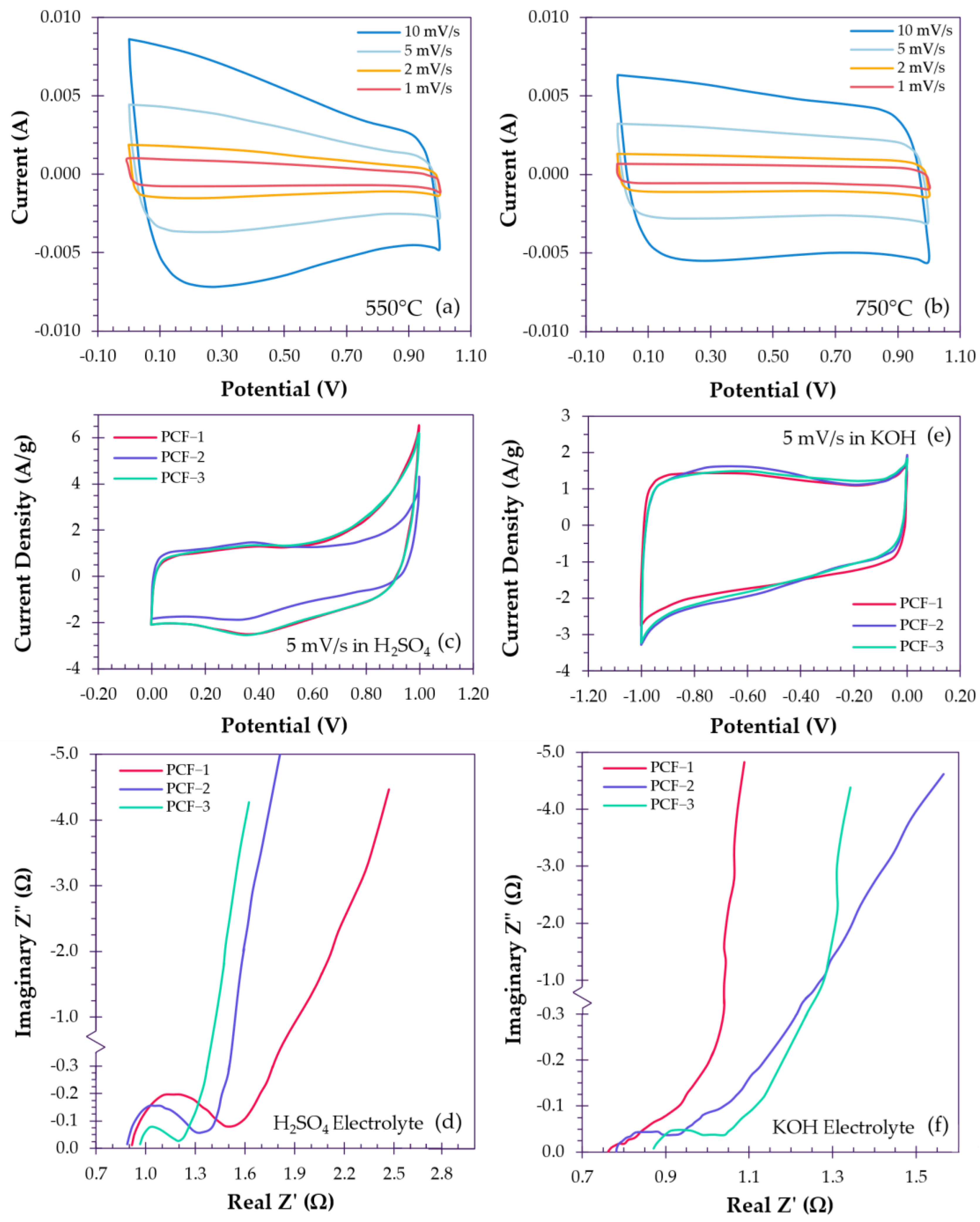 | Pitch/PAN ACNFs | 1724 | 49.20% | Symmetrical Two-Electrode | 6 M KOH | 143.5 | 1 mA/cm2 | – | – | [96] |