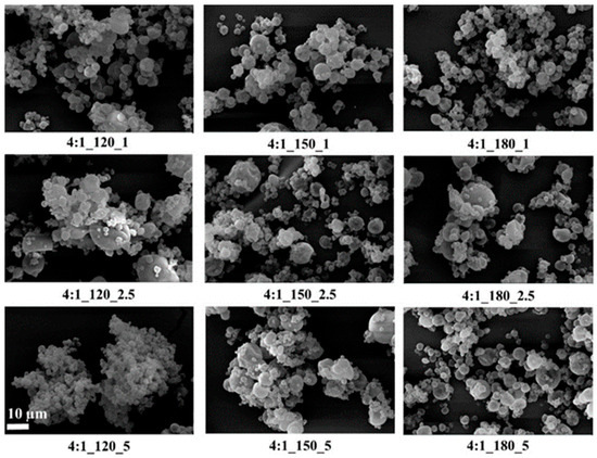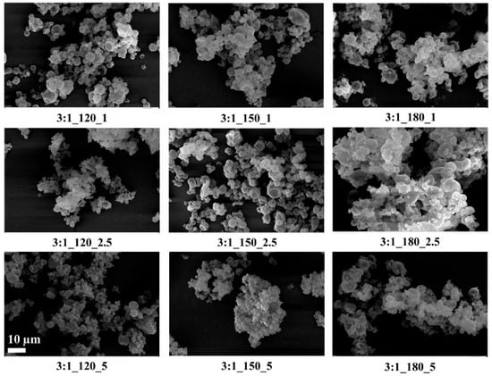 The results showed that the average sizes of microcapsules produced at wall-to-core ratios of 3:1, 4:1, and 6:1 with varying inlet temperatures and feed rates were ranged between 1 and 9 µm. Studies in the literature [76,77,78,79,80,81] have reported that the average size of microcapsules prepared via spray drying with various oils ranges from 3 to 15 µm. As the microcapsule size decreased, the increase in the tendency to agglomerate was also seen in SEM images. Upon examining Figure 2 and Figure 3, it was observed that agglomeration was more pronounced in the images corresponding to the 3:1_120_2.5 (1.02 µm) and 4:1_120_5 (1.09 µm) samples, which exhibited the lowest D50 values. This result is consistent with the information in the literature that smaller capsules tend to agglomerate more than larger ones [82]. The agglomeration of microcapsules in a matrix has a negative effect on their application potential [83]. Some studies stated that the microcapsule agglomerations acted as defects and reduced the mechanical performance [82,84].