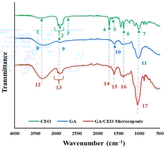 FTIR analysis was conducted on one of the microcapsules (4:1_180_5) to identify the characteristic peaks of CEO and GA. Figure 6 and Table 2 present the infrared spectra of CEO, GA, and one of the GA/CEO microcapsules (4:1_180_5).