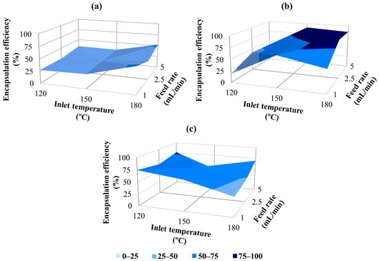 Feed rate is one of the most important parameters affecting microcapsule formation in the spray drying method. It should be adequate to ensure that the liquid evaporates before the particles contact the drying chamber wall [12]. Generally, better encapsulation efficiency results were obtained at 2.5 and 5 mL/min feed rates compared to 1 mL/min, while keeping the wall-to-core ratio and inlet temperature constant. These findings were consistent with studies reporting higher efficiency by increasing the feed rate [100,101]. Alvarenga Botrel et al. [102] also stated that the improvement in oil retention at high feed rates may be due to the rapid formation of the semi-permeable membrane due to the higher solids content in the drying chamber. However, as an exceptional case, the highest efficiency value was observed at the lowest feed rate of 1 mL/min in samples produced at 180 °C temperature with a 3:1 wall/core ratio. It is also stated in the literature [102] that high encapsulation efficiency can be achieved in high inlet temperature/low feed rate combinations.