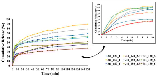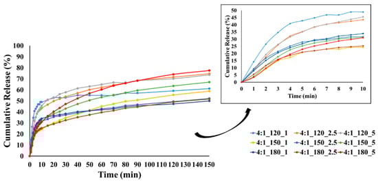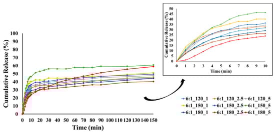In this study, TGA was selected as an indirect but reliable method to monitor the volatilization-driven release of CEO, which is dominated by evaporation rather than dissolution in aqueous media. TGA was employed to distinguish weight loss regions associated with moisture and essential oil evaporation and to evaluate relative trends among formulations rather than to derive absolute release kinetics. Figure 9, Figure 10 and Figure 11 show the cumulative release profiles of CEO from microcapsules prepared with wall-to-core ratios of 3:1, 4:1, and 6:1, respectively. It could be seen that the microcapsules exhibited an initial burst release ranging approximately between 22 and 48% in the first 10 min. Although cumulative burst release reached up to ~50% for all groups, 4:1 and 6:1 showed lower initial burst release rates in general. The initial burst release is affected by various parameters such as encapsulation efficiency, polymer relaxation, cross-linking between oil and wall material, oil content on or close to the surface of microcapsule, pore size and distribution of the wall material, wall thickness, incomplete removal of solvent, etc. [104,105,106].
