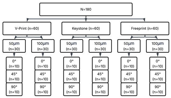 Three different commercial 3D-printing-compatible occlusal splint materials—KeySplint Hard, Freeprint Splint 2.0, and V-Print Splint—were used to prepare rectangular rod-shaped specimens measuring 3.3 × 10 × 64 mm (Table 1). For each material, a combination of two different layer thicknesses (50 µm and 100 µm) and three different printing orientations (0°, 45°, 90°) was applied, creating a total of 18 experimental groups. Each group contained 10 samples, resulting in a total of 180 samples (Figure 1).
