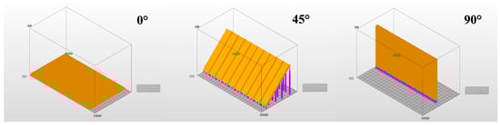 As shown in Figure 3, specimens printed at 0° demonstrated smoother surfaces (Ra = 0.103 ± 0.003 µm) compared with those printed at 45° (0.138 ± 0.004 µm) and 90° (0.123 ± 0.004 µm).