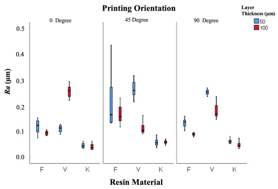 Box-and-whisker plot of roughness values according to resin, layer thickness, and printing orientation. (F: Freeprint Splint 2.0, V: V-Print Splint, K: KeySplint Hard).