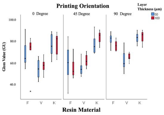 Box-and-whisker plot of gloss values according to resin, layer thickness, and angle. (F: Freeprint Splint 2.0, V: V-Print Splint, K: KeySplint Hard). (* p < 0.05).