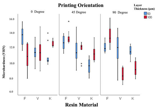 Box-and-whisker plot of microhardness values according to resin, layer thickness, and angle. (F: Freeprint Splint 2.0, V: V-Print Splint, K: KeySplint Hard). (* p < 0.05).