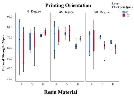 Box-and-whisker plot of flexural strength values according to resin, layer thickness, and angle. (F: Freeprint Splint 2.0, V: V-Print Splint, K: KeySplint Hard). (* p < 0.05).