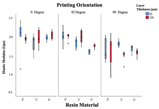 Box-and-whisker plot of elastic modulus values according to resin, layer thickness, and angle. (F: Freeprint Splint 2.0, V: V-Print Splint, K: KeySplint Hard). (* p < 0.05).