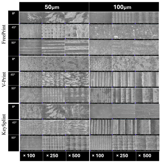 Representative SEM micrographs of splint surfaces printed at 0°, 45°, and 90° orientations with layer thicknesses of 50 µm and 100 µm, captured at 100×, 250×, and 500× magnifications. The images illustrate characteristic layer lines and resin-dependent differences in surface morphology across the three materials (Freeprint, V-Print, and KeySplint). Minor variations in image clarity—arising from inherent surface texture and resin-specific topography—do not affect the scientific interpretation of printing-orientation effects or comparative evaluations among resins.