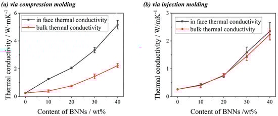 In-plane and bulk thermal conductivities of PVDF/BNNs composites: (a) compression-molded; (b) injection-molded.