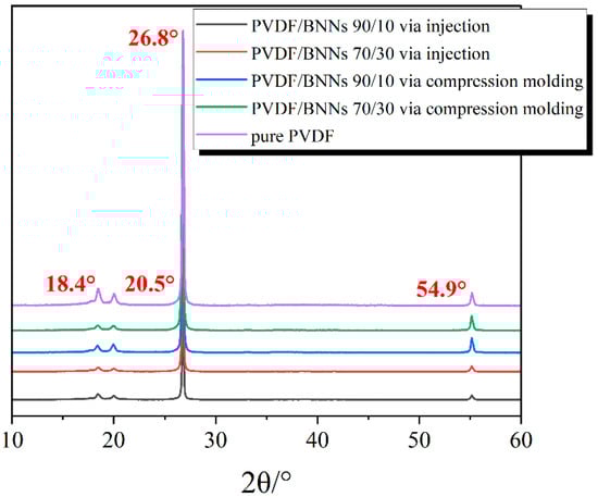 To investigate the effect of processing methods on the crystal form of PVDF, X-ray diffraction (XRD) was used to characterize the sample structure. The test conditions were scanning from 10° to 60° at a step of 10°/min. Figure 6 shows the XRD spectra of PVDF/BNNs 90/10 and 70/30 composites prepared by different molding methods. The diffraction peaks at 2θ of 18.4° (020) and 26.8° (021) were assigned to the α-crystal form of PVDF, the diffraction peak at 2θ of 20.5° (200) was assigned to the β-crystal form of PVDF, and the diffraction peak at 54.9° corresponds to the (004) crystal plane of BNNs. It can be seen that, regardless of the molding method (compression molding or injection molding) and the PVDF/BNNs mass ratio, the XRD patterns only exhibit the above four diffraction peaks, indicating that the composites coexist with α and β crystal forms [34,35].