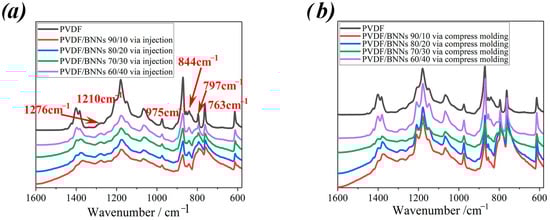 FTIR spectra of PVDF/BNNs composites prepared by different molding methods, (a) PVDF/BNNs composites prepared via injection, (b) PVDF/BNNs composites prepared via compress molding. (From top to bottom, the samples correspond to pure PVDF, PVDF/BNNS mass ratios of 90/10, 80/20, 70/30, and 60/40, respectively).