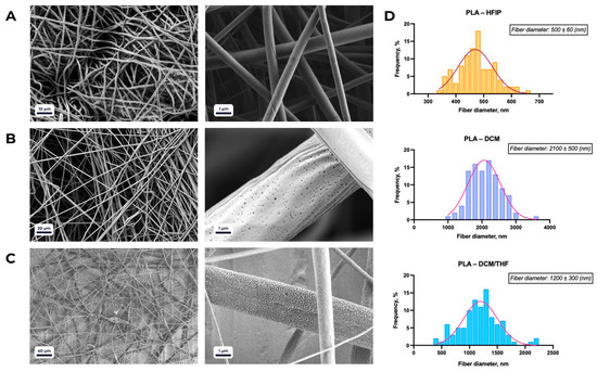 SEM micrographs of PLA-based scaffolds electrospun using different solvents: (A) 1,1,1,3,3,3-hexafluoro-2-propanol (HFIP); (B) dichloromethane (DCM); (C) DCM/tetrahydrofuran (THF) mixture (8:2, v/v). (D) Average fiber diameters (mean ± SD) corresponding to the conditions shown in panels (A–C).