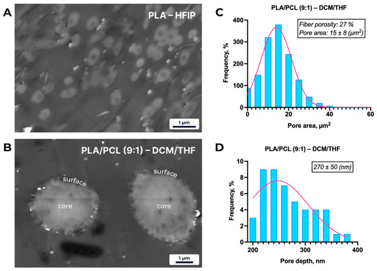 Cross-sectional micrographs of PLA–HFIP fibers (Figure 4) reveal a smooth, defect-free surface, consistent with SEM observations. In contrast, PLA/PCL (9:1) fibers electrospun from DCM/THF exhibit a heterogeneous distribution of surface-localized pores, with an average fiber porosity of 27%, a mean pore depth of 270 ± 50 nm, and an average pore area of 15 ± 8 µm2.