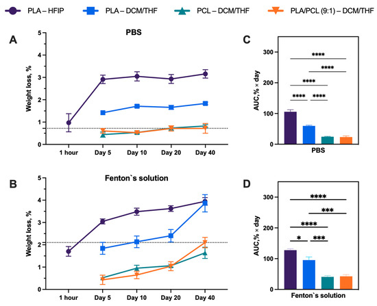 (A,B) Degradation kinetics, quantified as weight loss (%), measured over time from 1 h to 40 days. (C,D) Cumulative degradation expressed as area under the curve (AUC). Data are presented as mean ± SEM, significant differences between groups: **** p < 0.0001, *** p < 0.001, * p < 0.05.