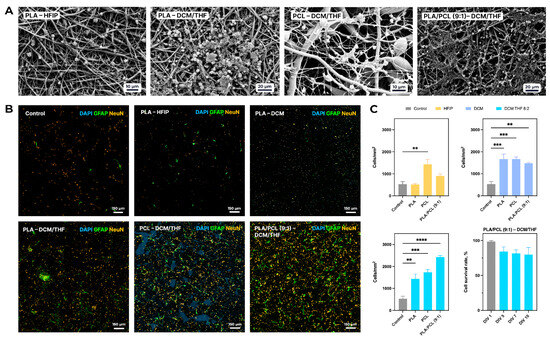 In the case of the scaffolds fabricated from the solution in HFIP, a significant increase in neuronal density compared to the control (523 ± 258 cells/mm2) was observed only for the PCL sample, which exhibited 1430 ± 383 cells/mm2 (p < 0.01). All porous matrices fabricated using DCM or DCM/THF (8:2) also demonstrated significantly higher neuronal densities than the control (Figure 8A). Notably, the PLA/PCL (9:1) scaffold electrospun with DCM/THF (8:2) showed the highest neuronal density, achieving 2426 ± 122 cells/mm2 (p < 0.0001 vs. control).
