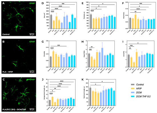 Comparative morphometric analysis of astrocytes across various scaffold compositions. Representative immunofluorescence images of GFAP-positive astrocytes cultured on control substrate (A), PLA–HFIP scaffolds (B), and PLA/PCL (9:1)–DCM/THF scaffolds (C). (D–K) Quantitative morphometric analysis of astrocyte morphology across all scaffold compositions. Data are presented as mean ± SEM. Significant differences vs. control: * p < 0.05, ** p < 0.01, *** p < 0.001, **** p < 0.0001.