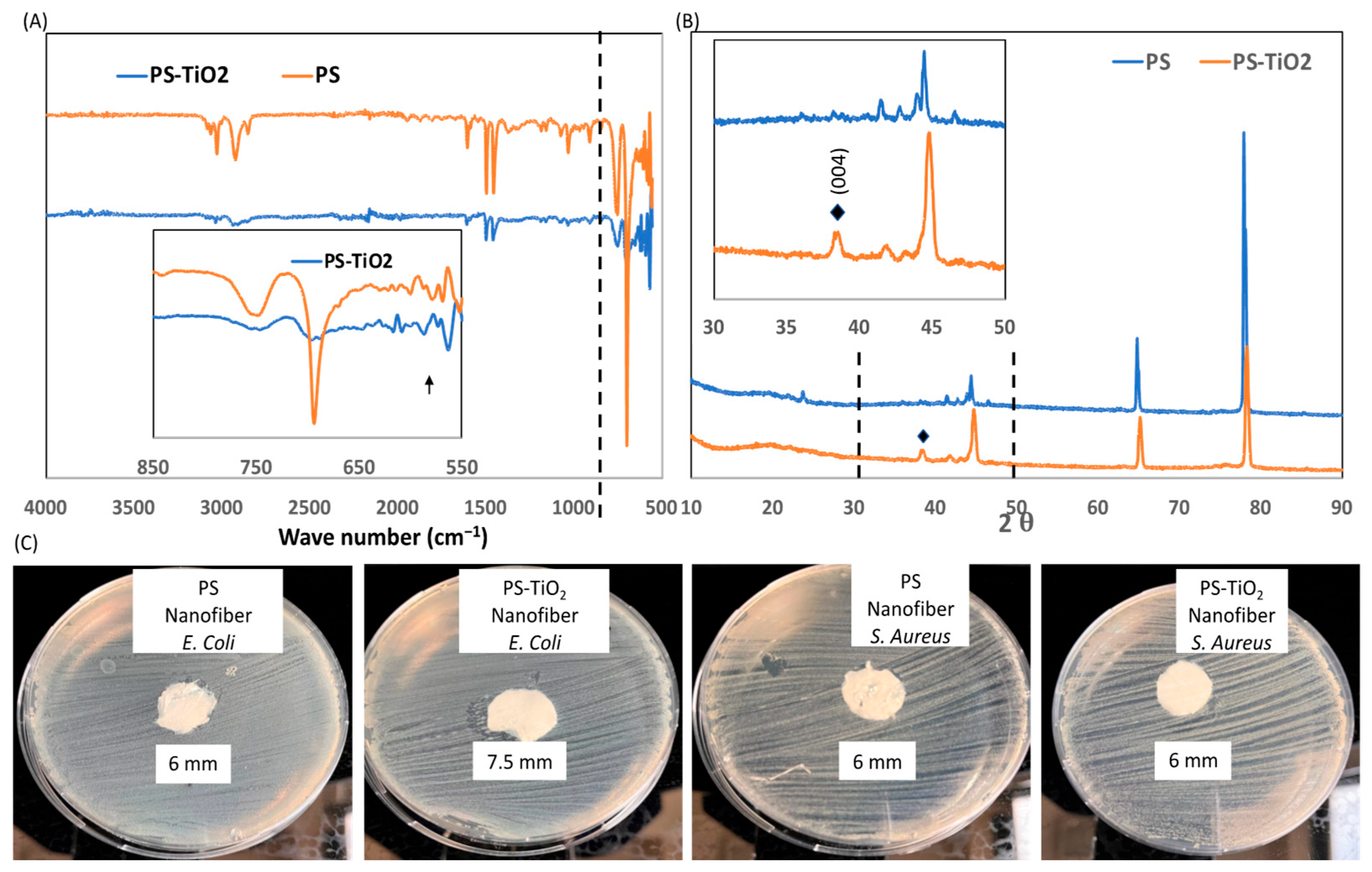 2.3. Characterization and Antibacterial Activity of PS and PS/TiO2 Nanofibers