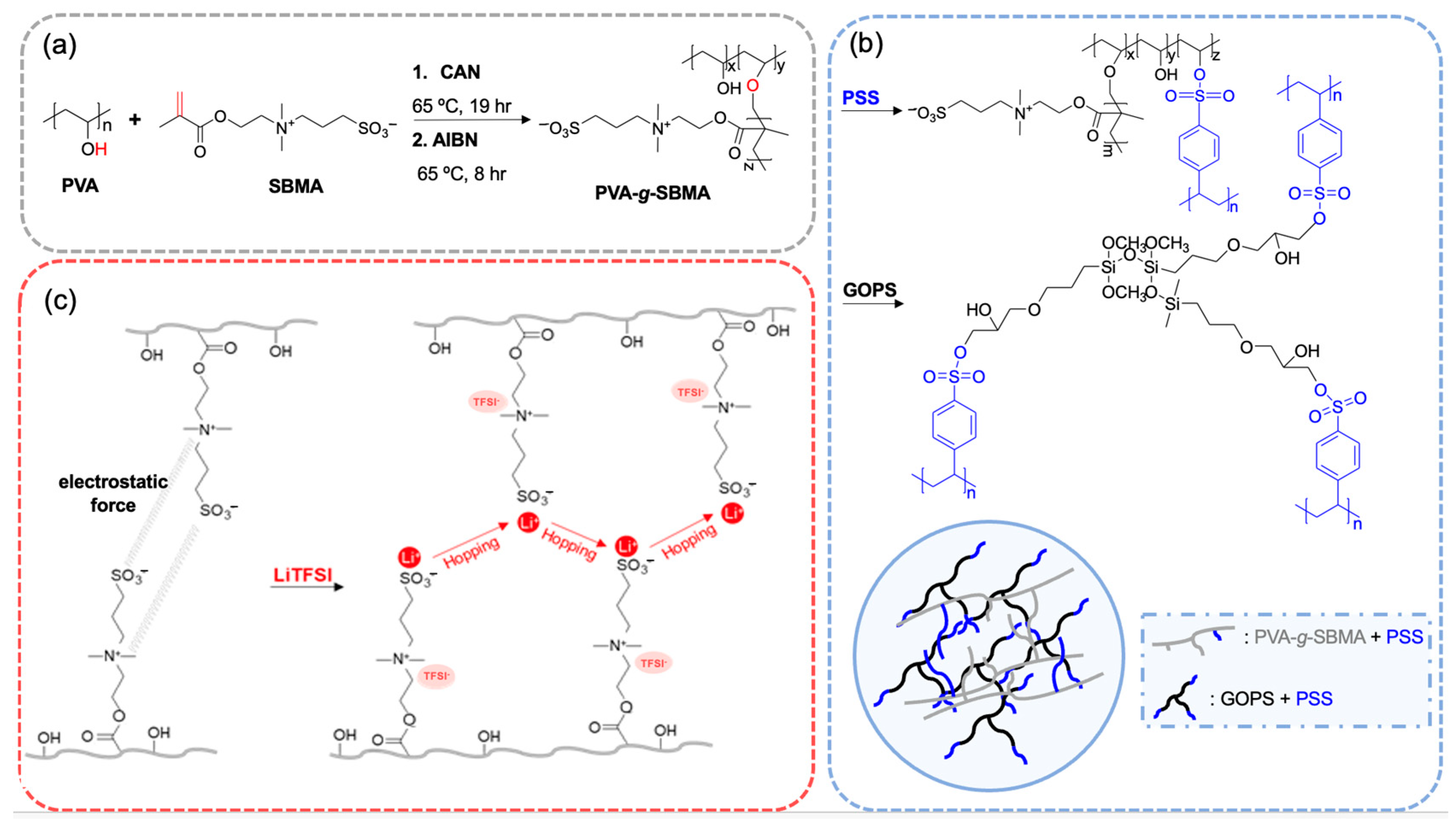 Figure 1b. Hydroxyl groups on PVA are crosslinked with sulfonic acid groups on PSS, and GOPS are bonded with PSS via epoxy–sulfonic acid reactions. Dual crosslinking between PVA–PSS and GOPS–PSS resulted in a network, improving the film’s mechanical strength. Lithium salt was mixed into films to form the solid polymer electrolyte, which is shown in