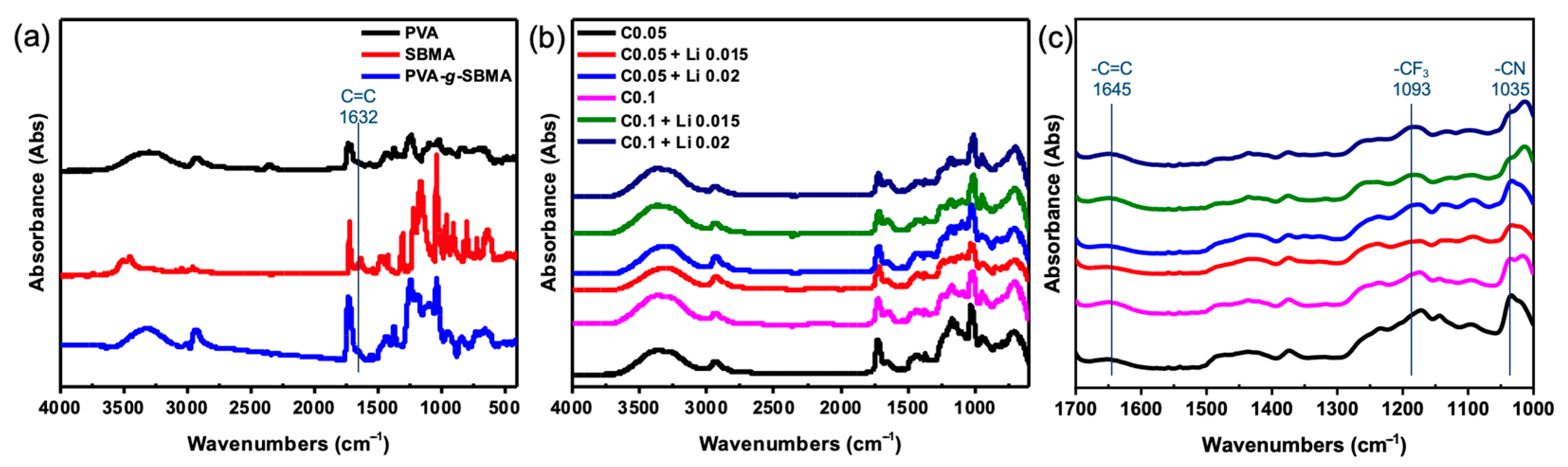 Figure 2c. These results suggest that a higher crosslinking degree (C0.1) improves the structural stability, and the presence of lithium salt interacts with functional groups from SBMA, leading to higher peak values in their corresponding FTIR signals.