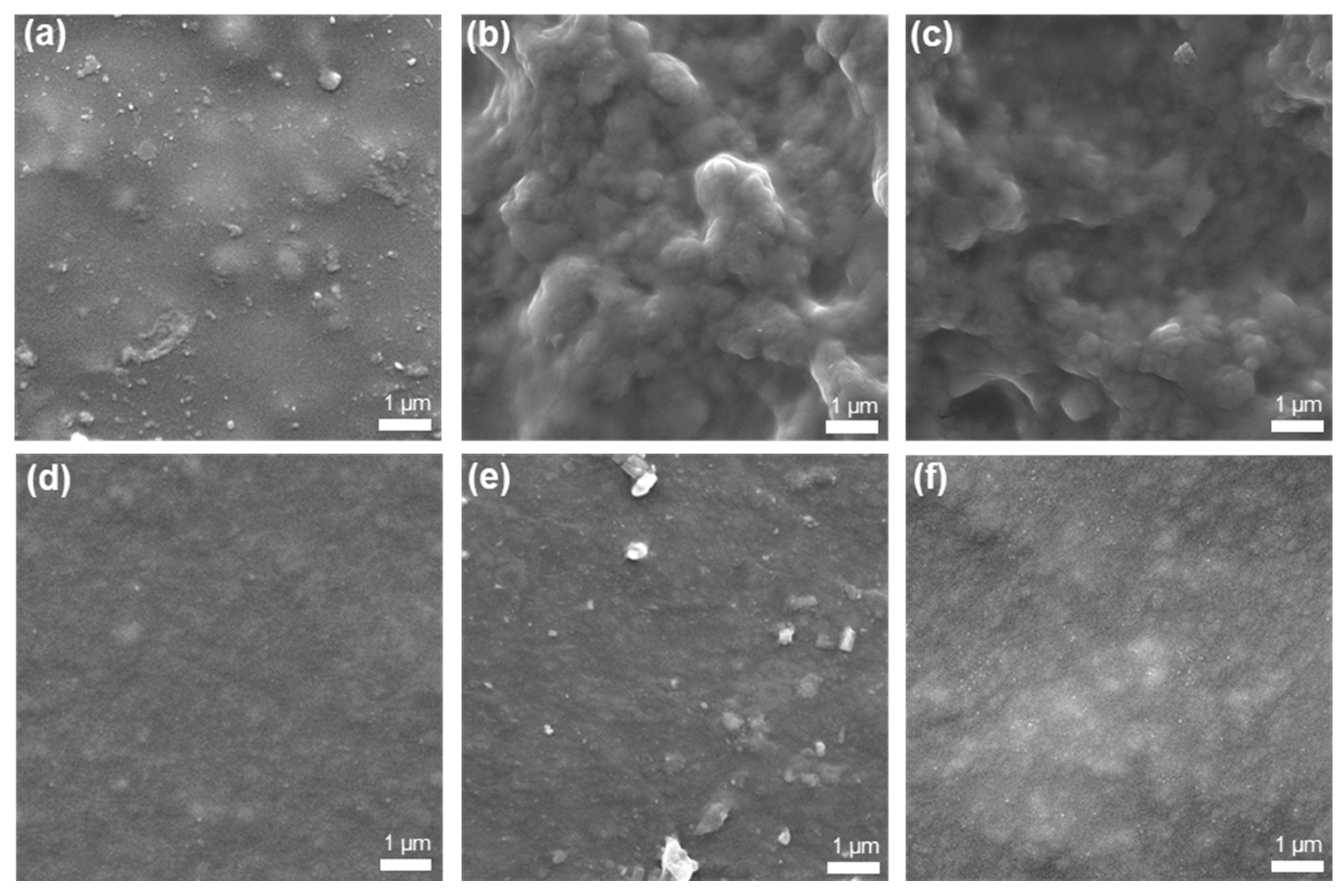 Figure 3d) is smooth, and protrusions are hard to find. Minor surface irregularities appear after adding 0.015 wt% LiTFSI (