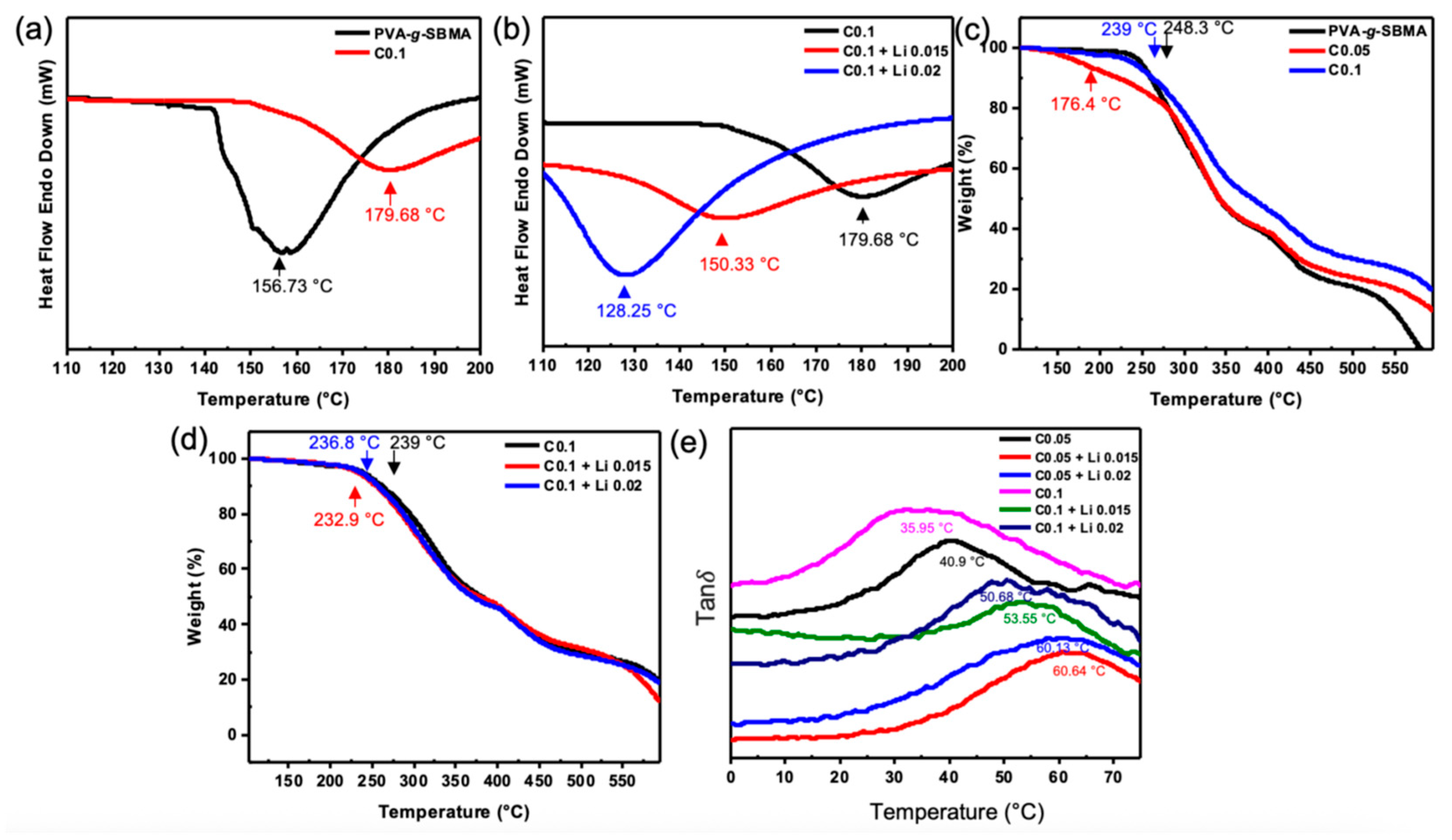 Figure 4e, the curves represent the Tan δ of the films with the peak corresponding to Tg. For the C0.1 without LiTFSI, Tg is 35.95 °C. Upon adding 0.015 wt% LiTFSI, Tg significantly increases to 53.55 °C. When the concentration is further increased to 0.02 wt%, Tg slightly decreases to 50.68 °C. This suggests that moderate LiTFSI doping can enhance thermal stability and restrict chain mobility. For the lower crosslinking density (C0.05), the C0.05 without LiTFSI shows Tg of 40.9 °C. With 0.015 wt% and 0.02 wt% LiTFSI, Tg increases to 60.64 °C and 60.13 °C, respectively. The marked rise in Tg indicates that LiTFSI addition effectively improves thermal stability. In summary, adding LiTFSI yields higher Tg values compared to undoped films. Additionally, lower Tg observed in highly crosslinked samples (C0.1) may offer better processability in subsequent applications.