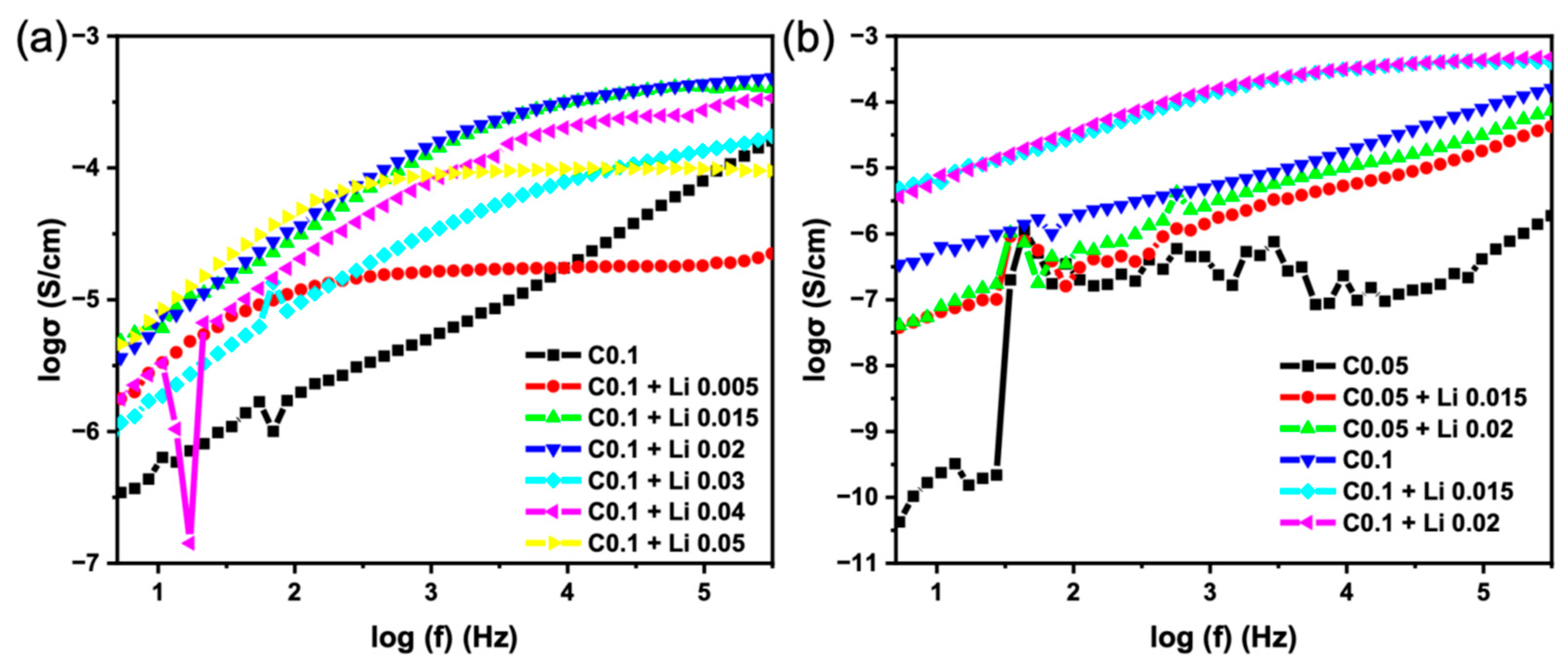 Optimum LiTFSI Ratio: The sample with the highest plateau, and therefore the highest DC ionic conductivity, is C0.1 + Li 0.015 and C0.1 + Li 0.02 (4.9 × 10−4 S/cm (green line) 4.6 × 10−4 S/cm (blue line), respectively). Adding too much or too little LiTFSI salt decreases the overall conductivity. This is a common phenomenon in solid polymer electrolytes, where an optimal concentration of salt provides enough mobile charge carriers (ions) without causing excessive ion aggregation, which would hinder their movement.