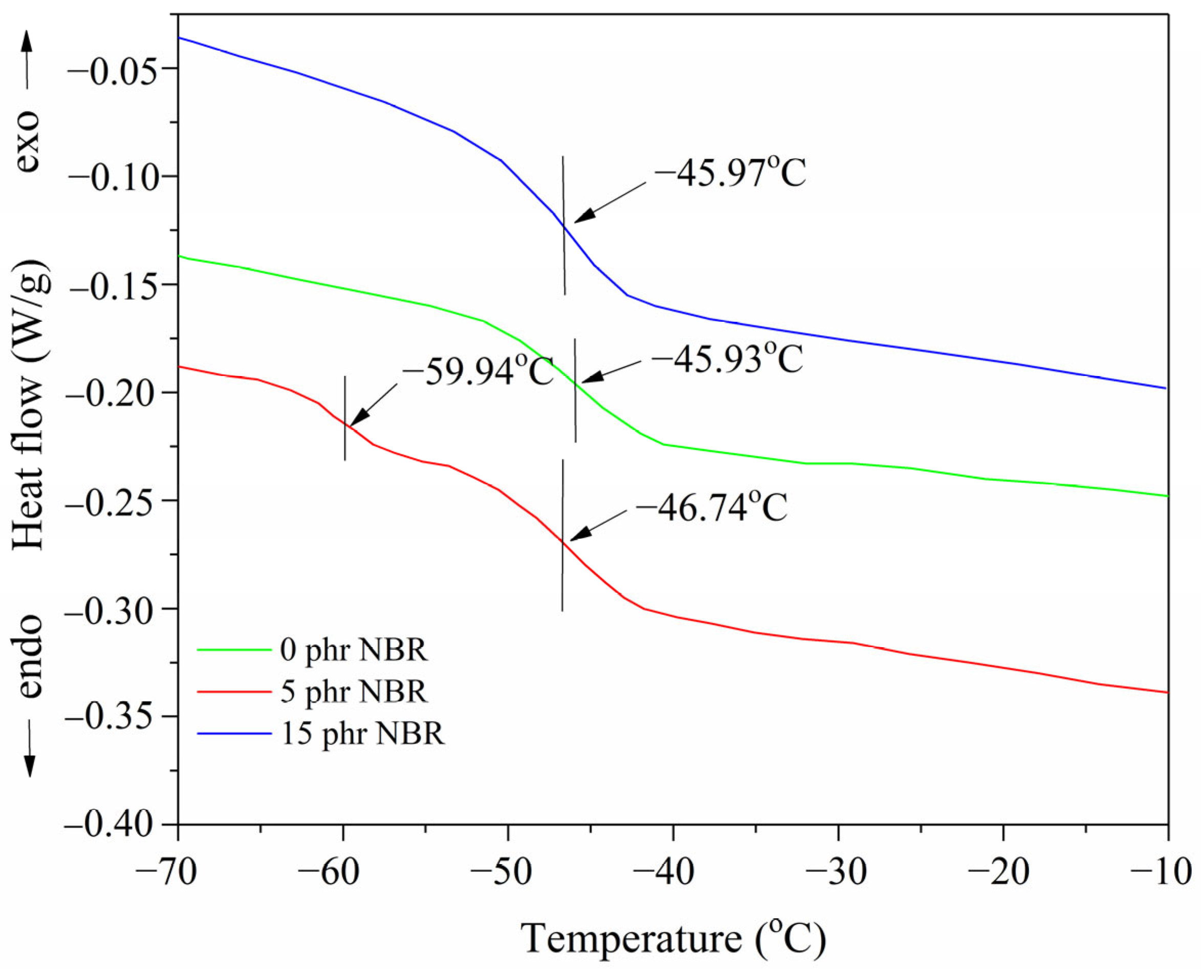 g was observed at –45.93 °C, indicating partial compatibility and cooperative segmental mobility between NR and SBR. With the addition of 5 phr NBR, two distinct T