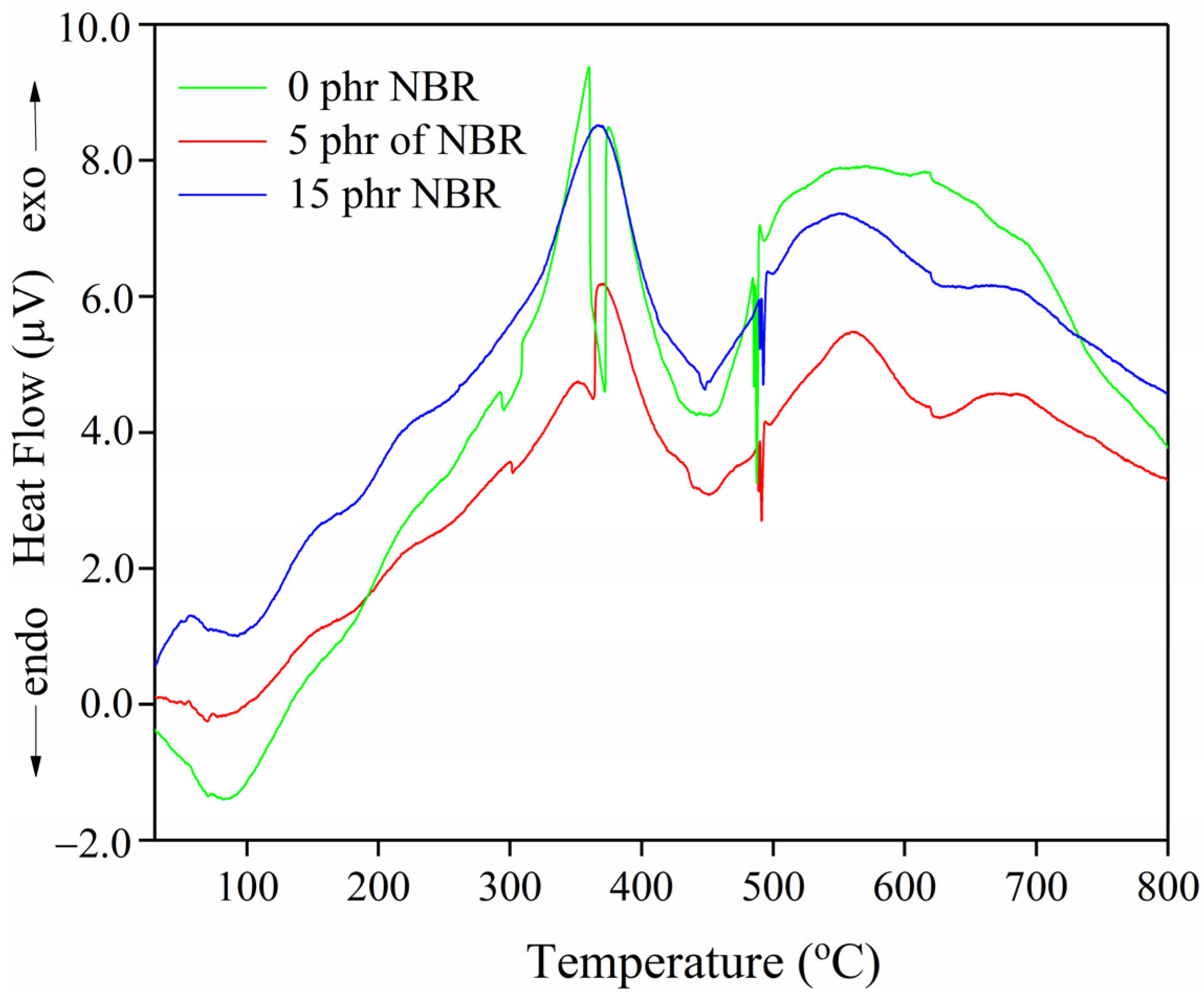 The exothermic DTA peaks (357.8 and 376.7 °C for 0 phr; 370.5 and 561.1 °C for 5 phr; 365.7 °C for 15 phr) reflect exothermic decomposition events and possible post-reactions occurring during thermal breakdown. The appearance of a second, higher-temperature exothermic peak (561.1 °C) in the 5 phr NBR sample suggests a more complex degradation mechanism, with the presence of thermally stable fragments that decompose only at elevated temperatures, consistent with the concept of a strengthened, more structured interphase region.