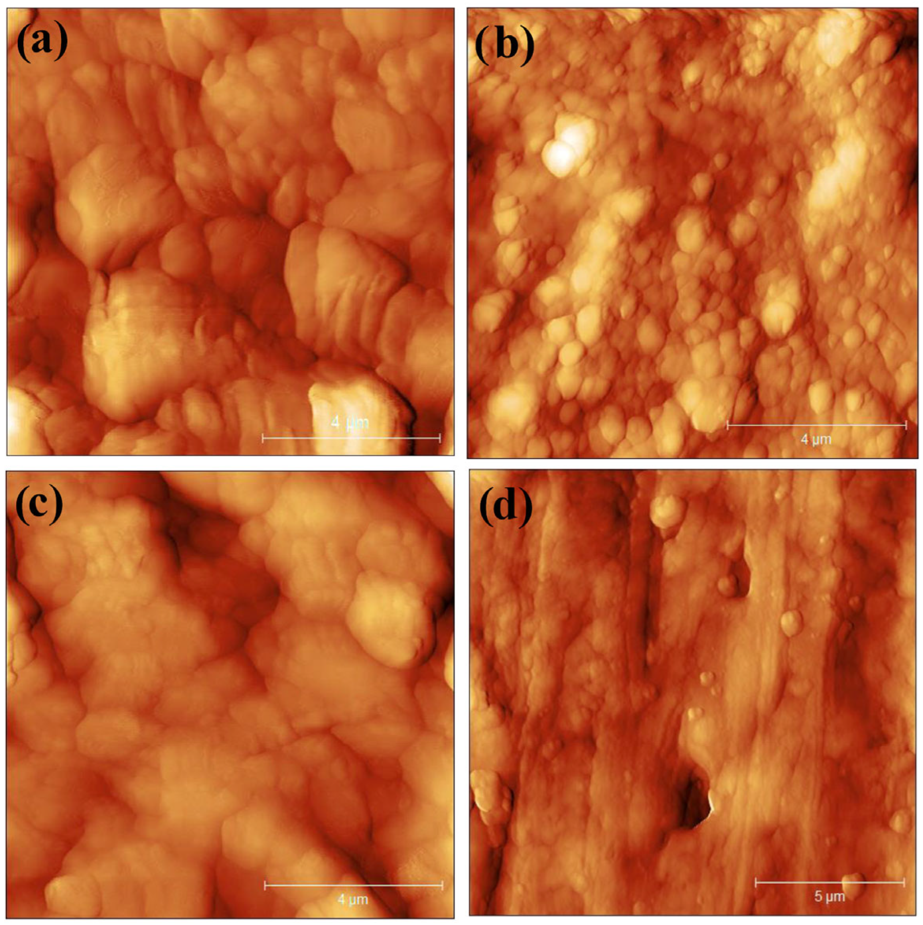 Atomic force microscopy (AFM) measurements were performed on a Quesant microscope (Quesant Instrument Corporation, Agoura Hills, CA, USA) operating in tapping mode in the air at room temperature. A thin slice of the specimen was glued to the holder using double-sided adhesive tape. Silicon tips (purchased from Nano and More) with a constant force of 40 N/m were used. AFM images were analyzed using Gwyddion software (version 2.53).